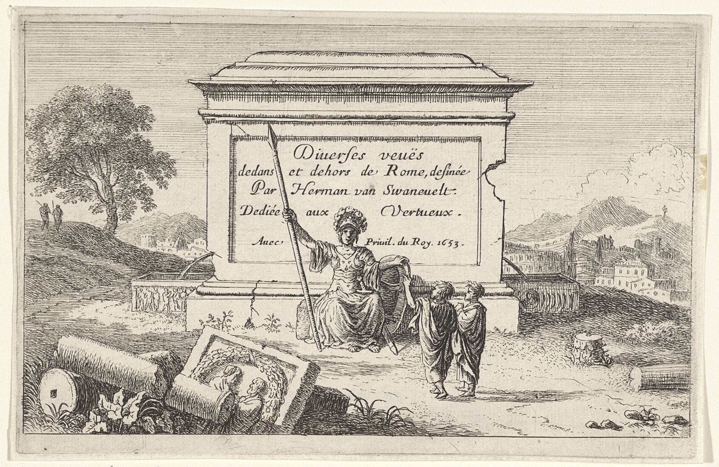 Voor een sokkel met een inscriptie zit Minerva met een speer, een helm en een schild. Voor haar staan twee figuren en op de grond liggen gebroken zuilen bij een basrelief met twee mannelijke bustes en een guirlande. In de verte ligt Rome. De serie is opgedragen aan 'Vertueux', de deugdzame.