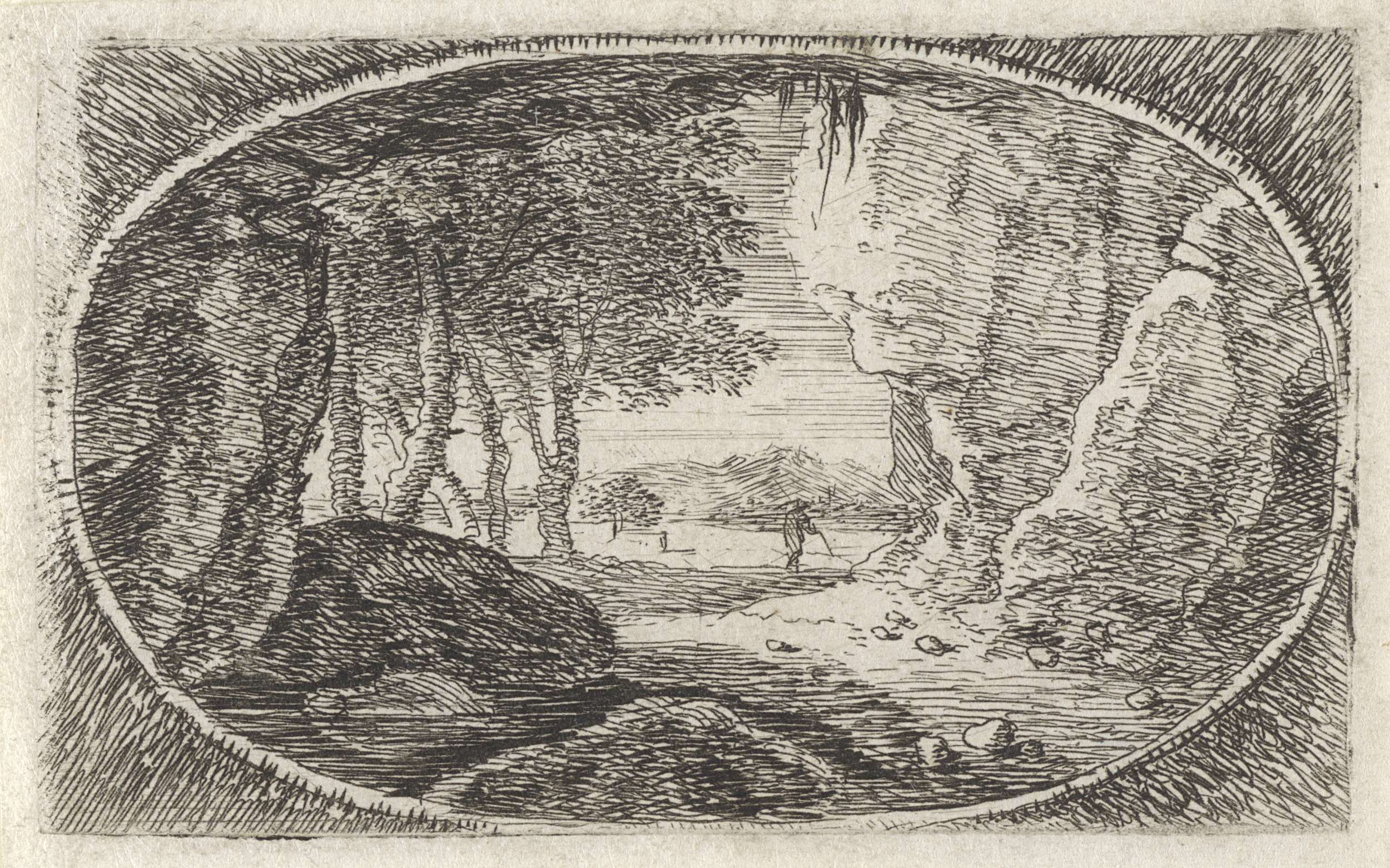In een ovale omlijsting loopt een wandelaar op een pad langs een grote rotspartij.