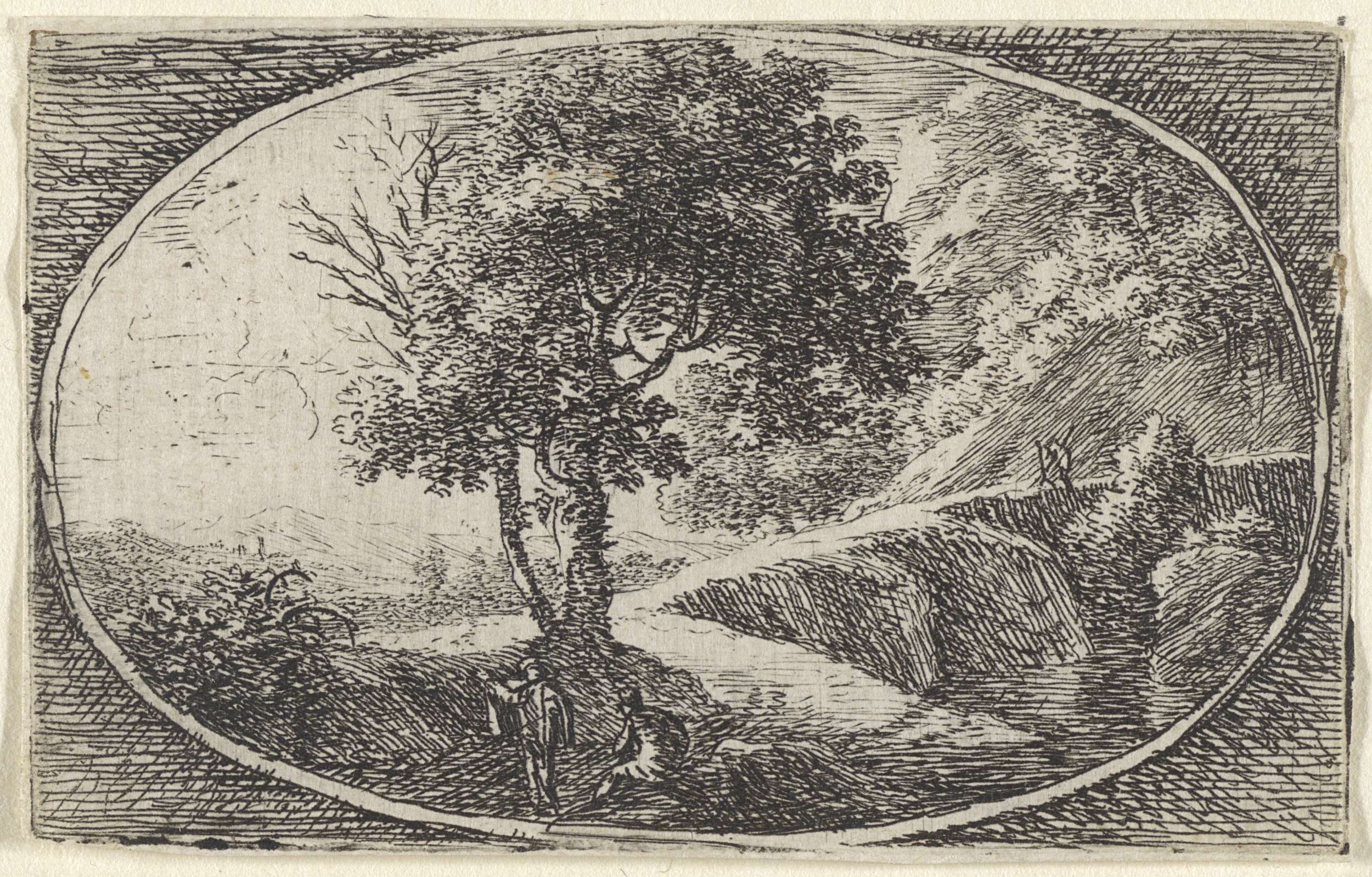 In een ovale omlijsting is een slingerend pad met enkele wandelaars te zien. Vooraan zit een figuur op de grond.