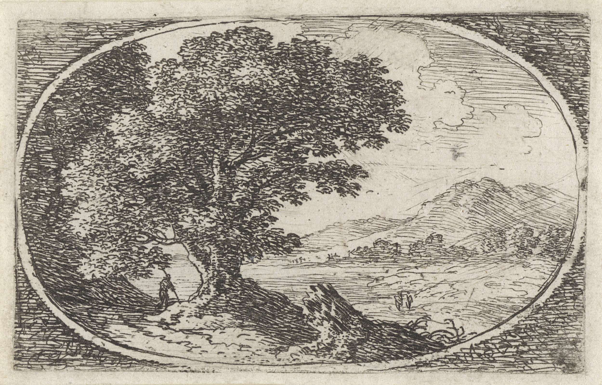 In een ovale omlijsting loopt een wandelaar op een pad bij een boom. Vooraan is een boomstronk te zien. In de verte liggen enkele heuvels.