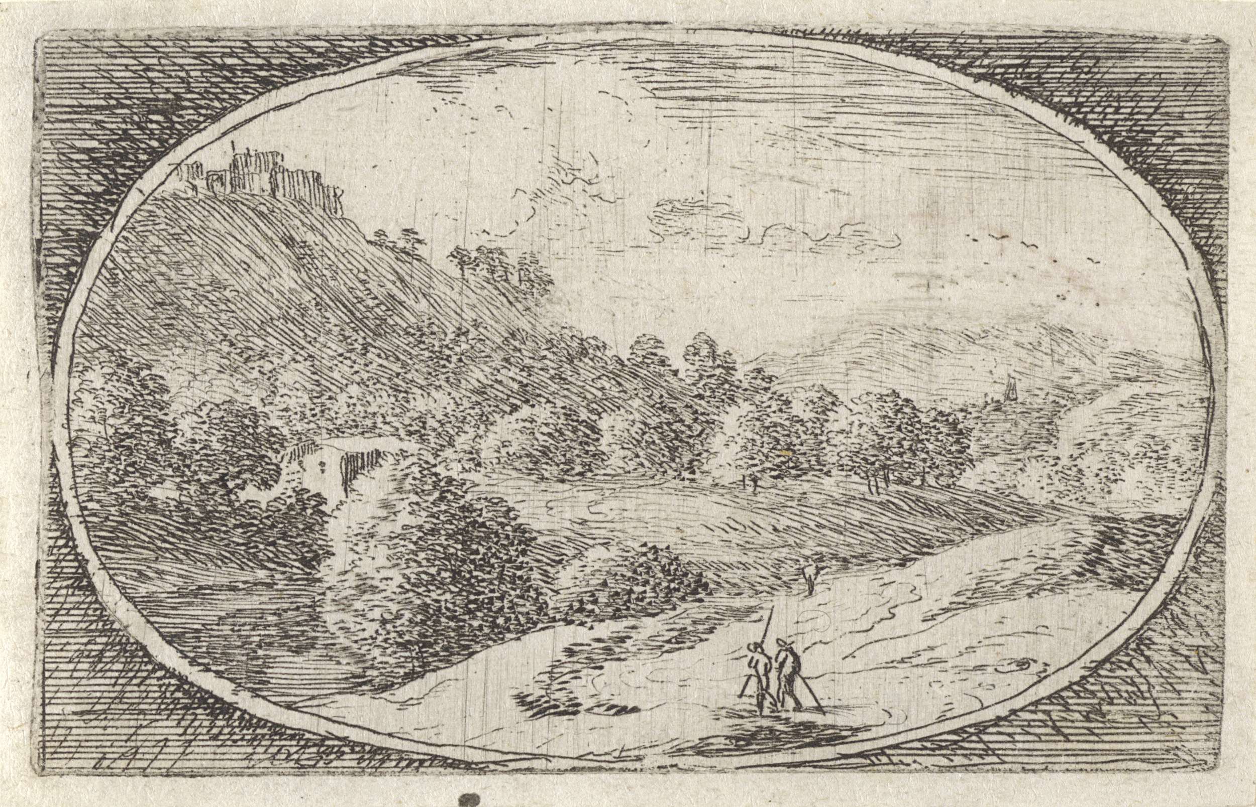 In een ovale omlijsting lopen twee wandelaars met stokken over een pad in een weids landschap. Links in de verte ligt een gebouw aan de voet van een heuvel. Op de heuvel staat nog een gebouw.