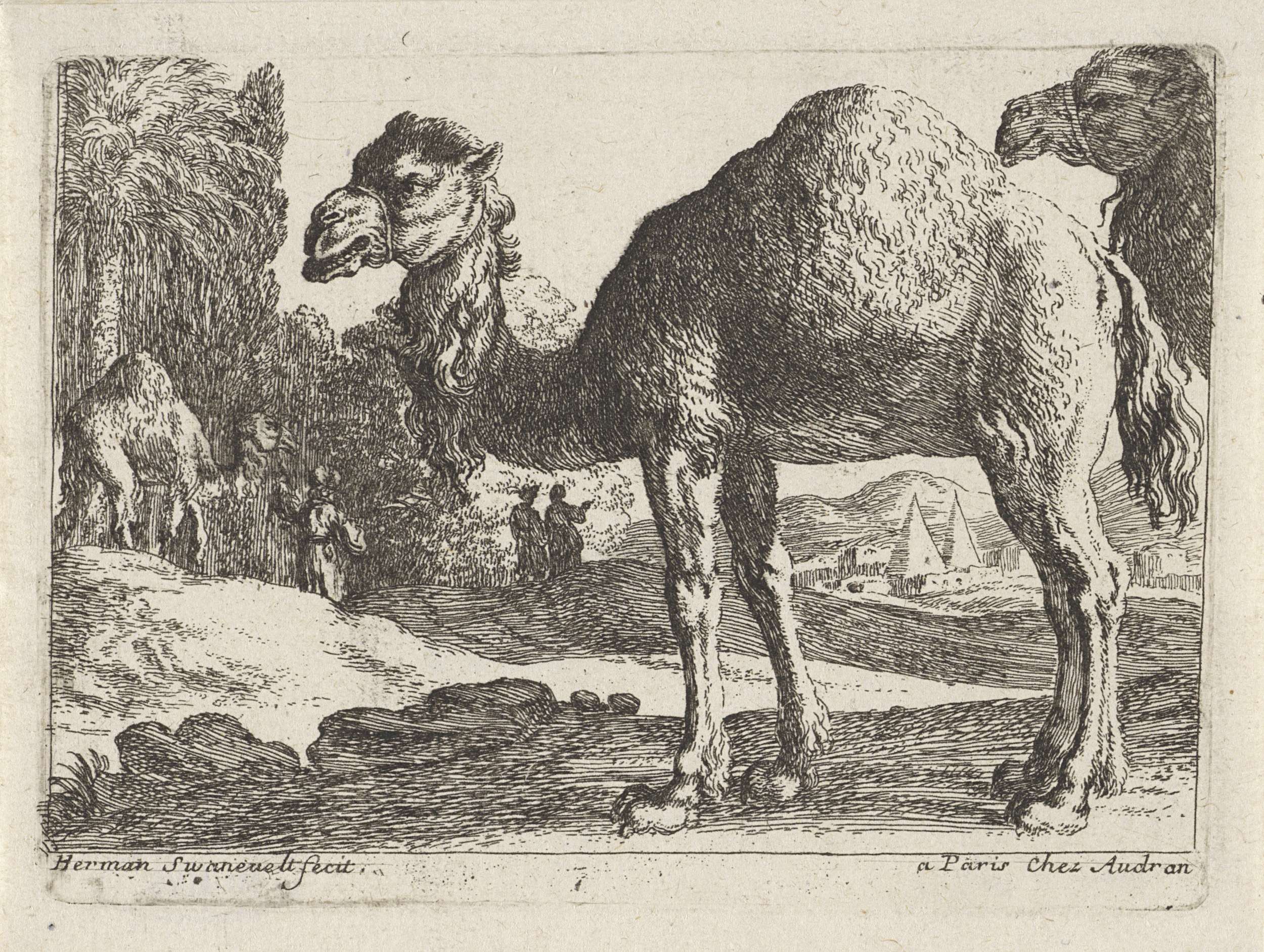 Achter twee kamelen leidt een man een derde kameel aan een teugel. In de verte staan twee piramidevormige bouwwerken.