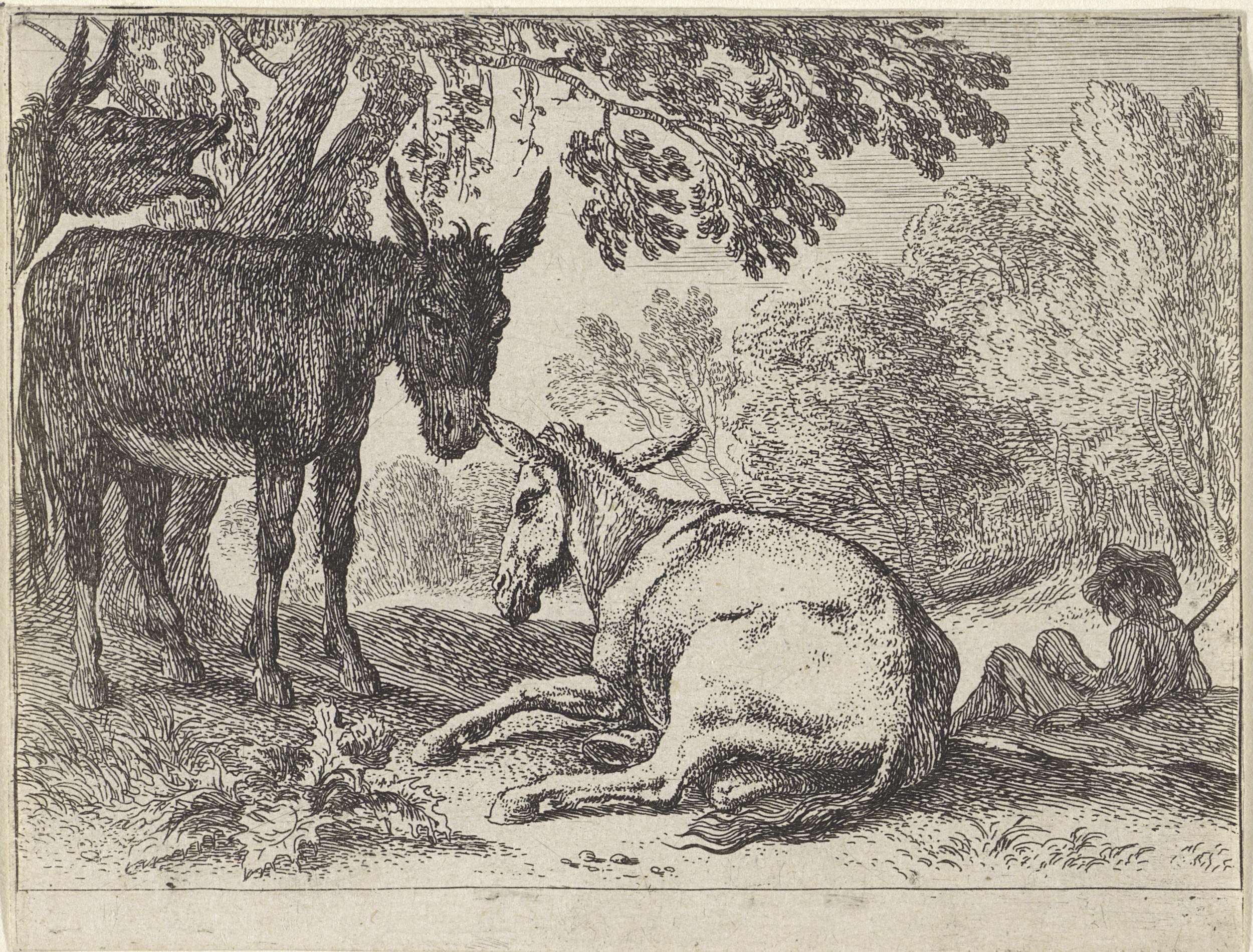 Achter drie ezels onder een boom rust een herder.