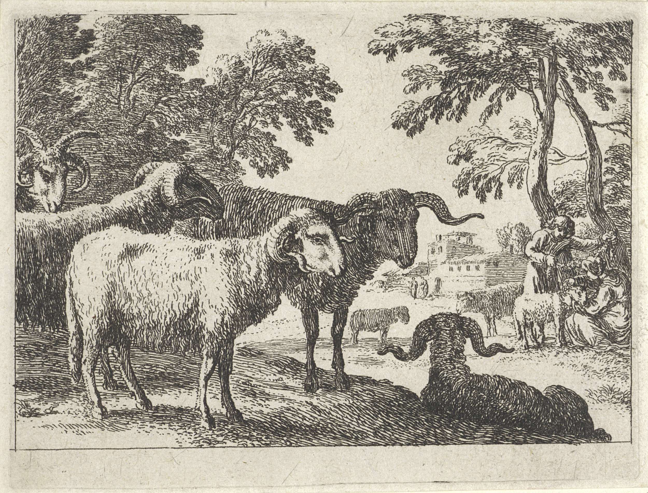 Achter vijf rammen zijn een herder en herderin met een kudde schapen te zien. In de verte ligt een gebouw.