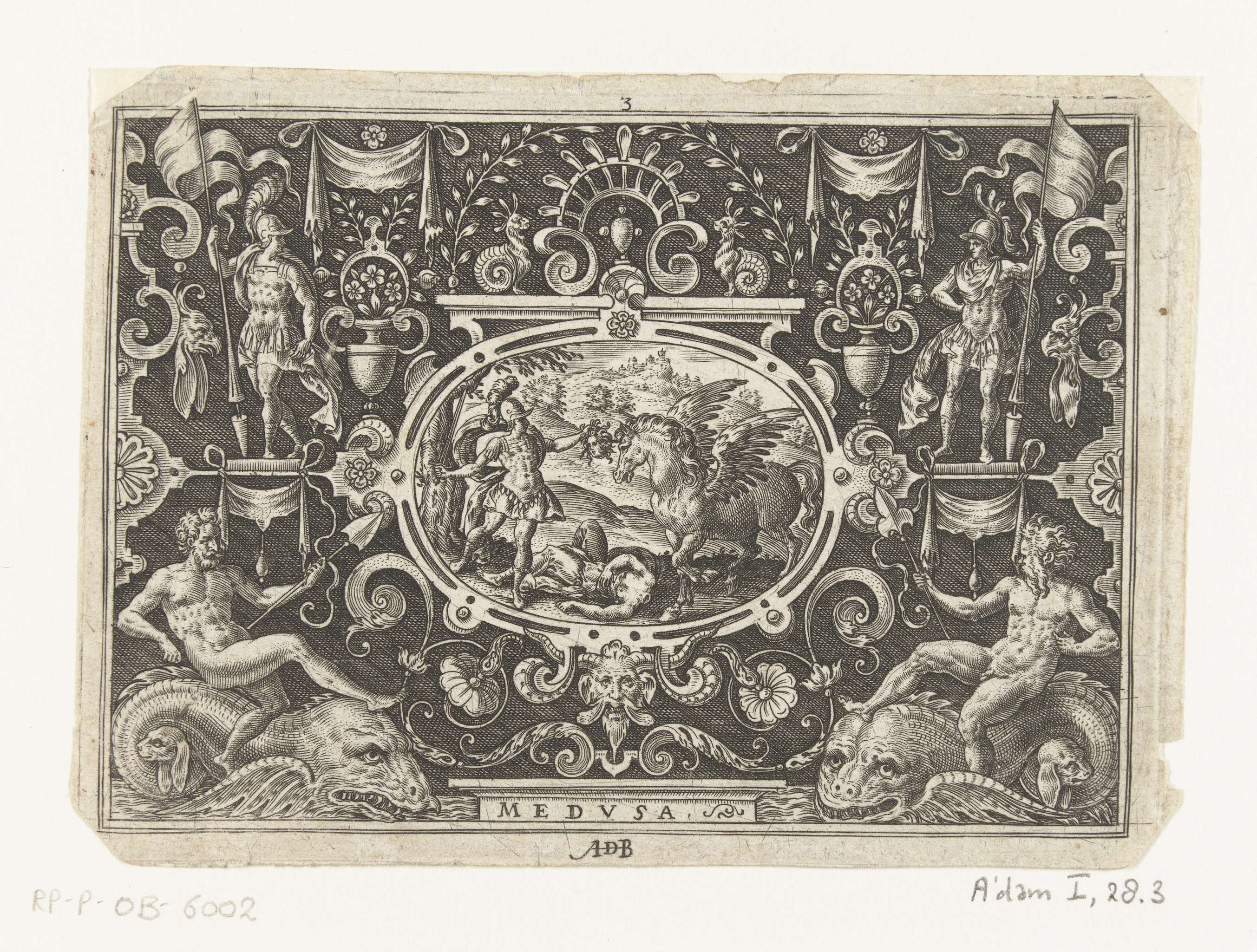 Perseus met het hoofd van Medusa. Haar lijk aan zijn voeten. In de omlijsting linksonder en rechtsonder een man op een zeemonster. Daarboven een krijgsman met vaandel. Gearceerde achtergrond.