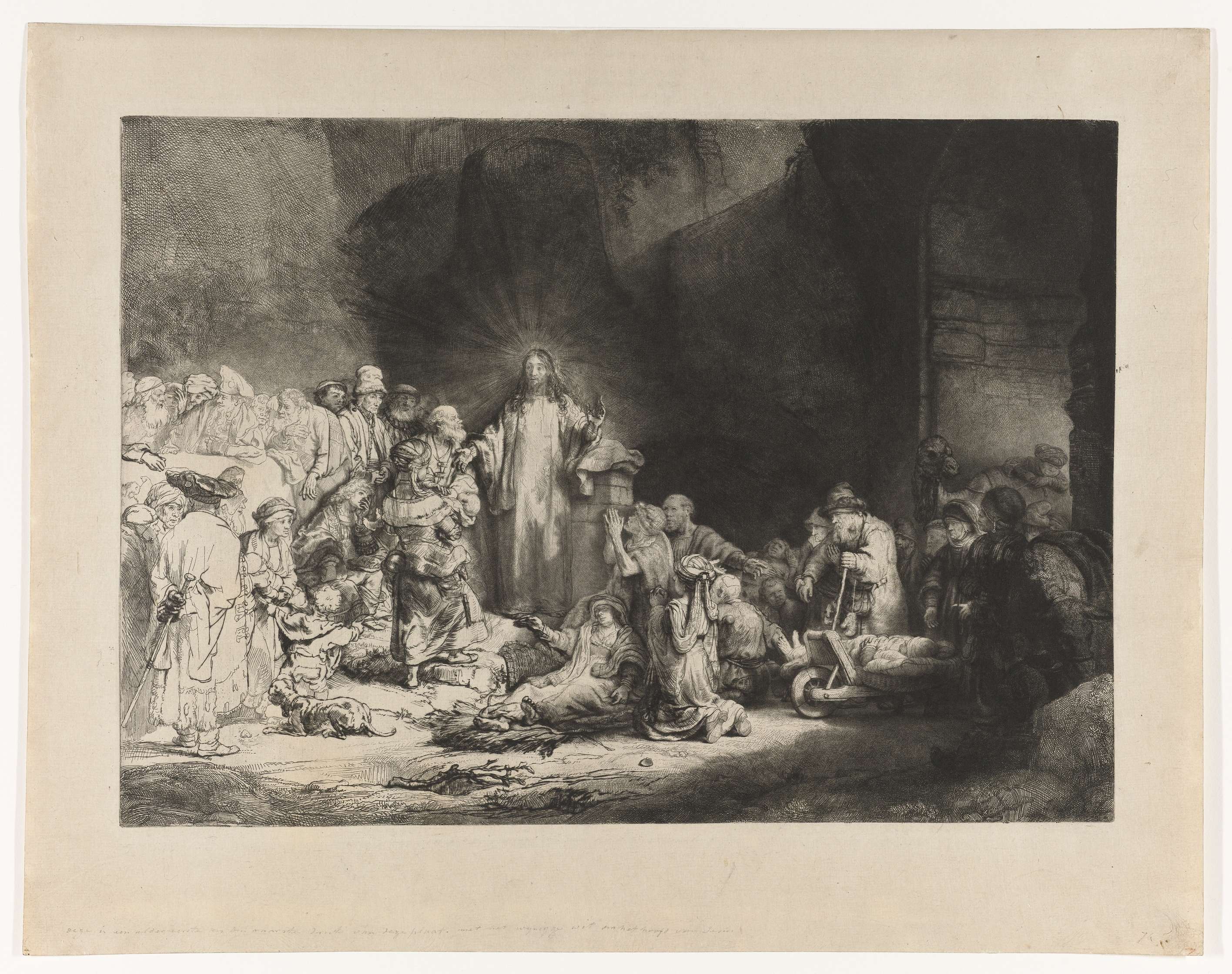 In dit meesterwerk vat Rembrandt op uiterst originele wijze een hoofdstuk uit de bijbel samen door alle figuren, rijk en arm, jong en oud, gezond en ziek, rond Jezus te groeperen. Daarbij bereikte hij bij de technische uitvoering nooit eerder vertoonde nuances in grijswaarden, van fluwelig zwart, via grijs, naar vrijwel wit. En aan de ...