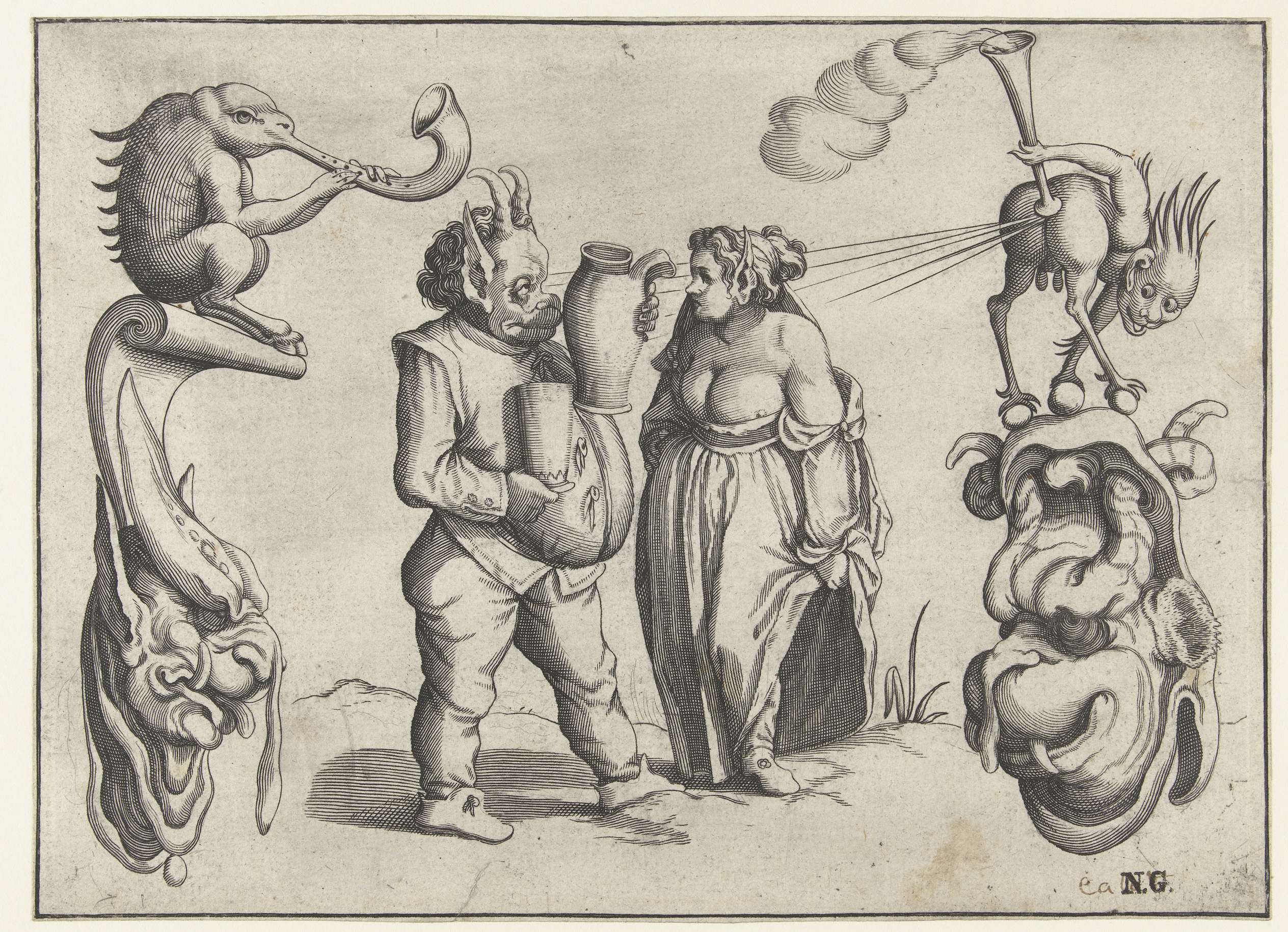 In het midden staan een vrouw en een mannelijk monster met een kan en een beker. Aan weerszijden zitten monsterdieren op maskers. No. 1 uit serie van 7 bladen.