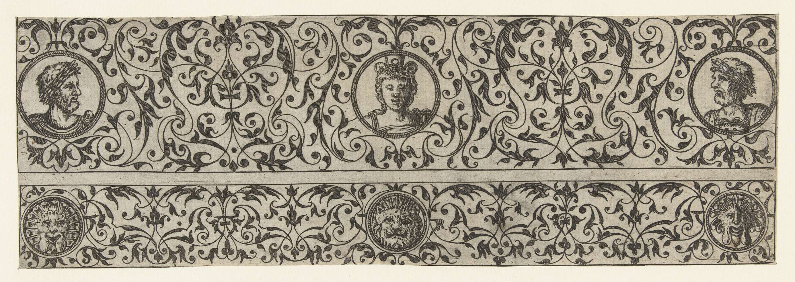 Midden in het bovenste fries zit een medaillon met het hoofd van een vrouw, aan elk uiteinde een medaillon met het hoofd van een man met een krans op. Een van 15 bladen afkomstig uit een serie van 23 met titelblad.