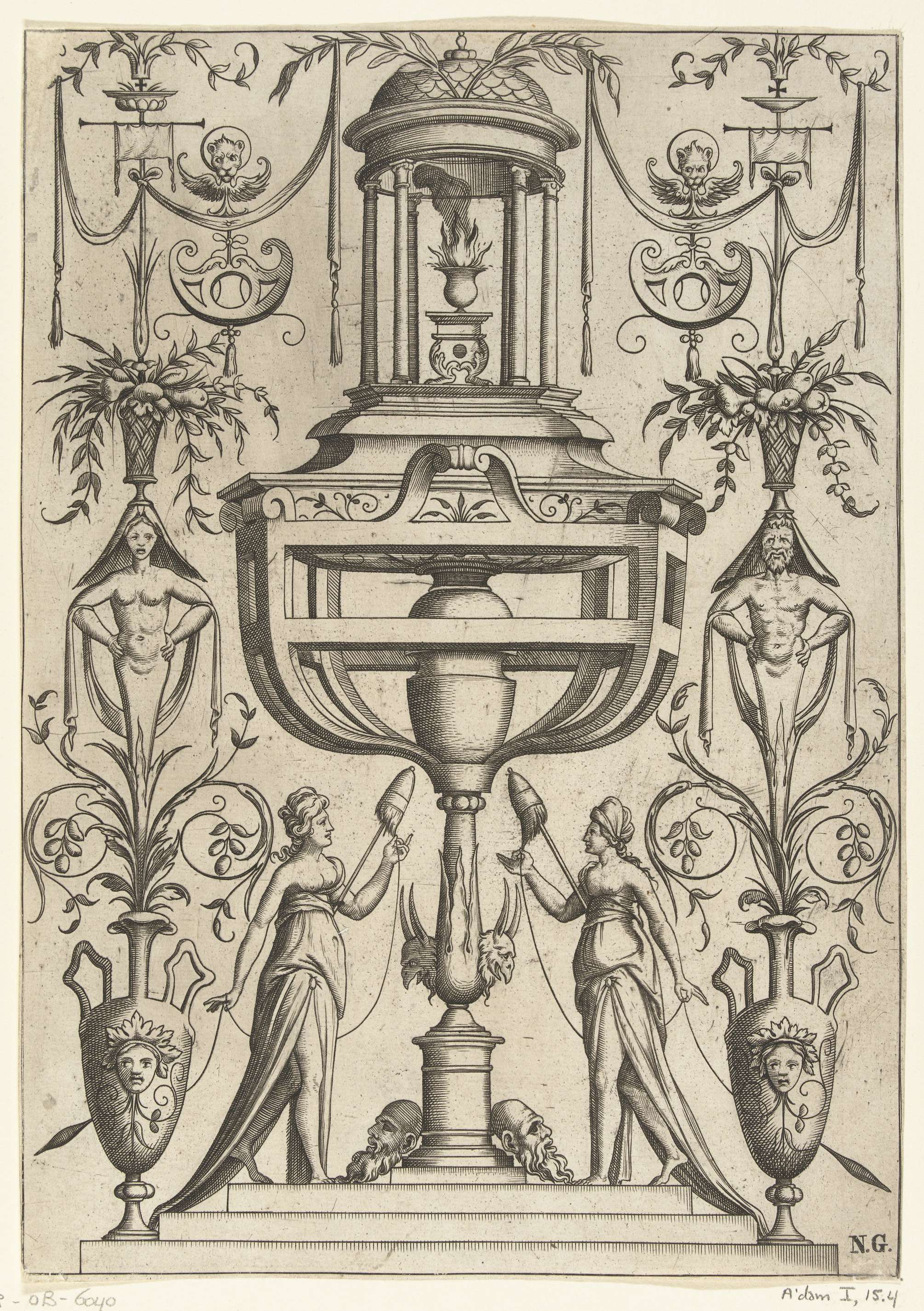 Aan weerszijden van de voet staat een vrouw met een spinrokken. Links en rechts verrijst een kandelaber. Blad uit serie van 9 bladen.