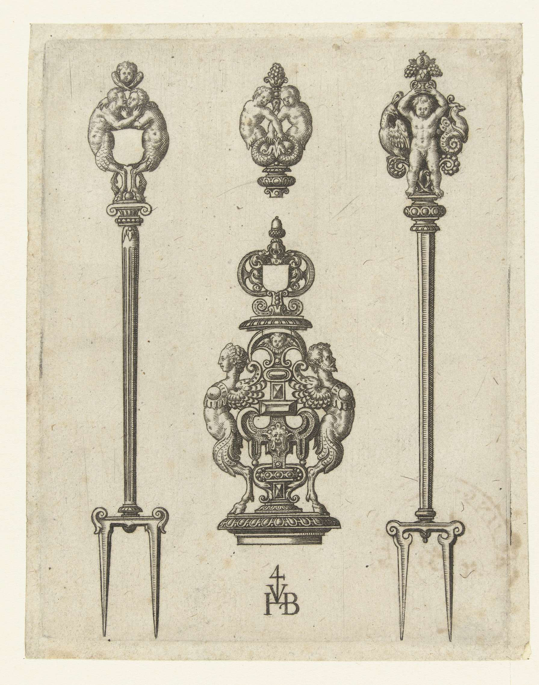 Blad met twee vorken met ornamentale bekroningen van grotesken