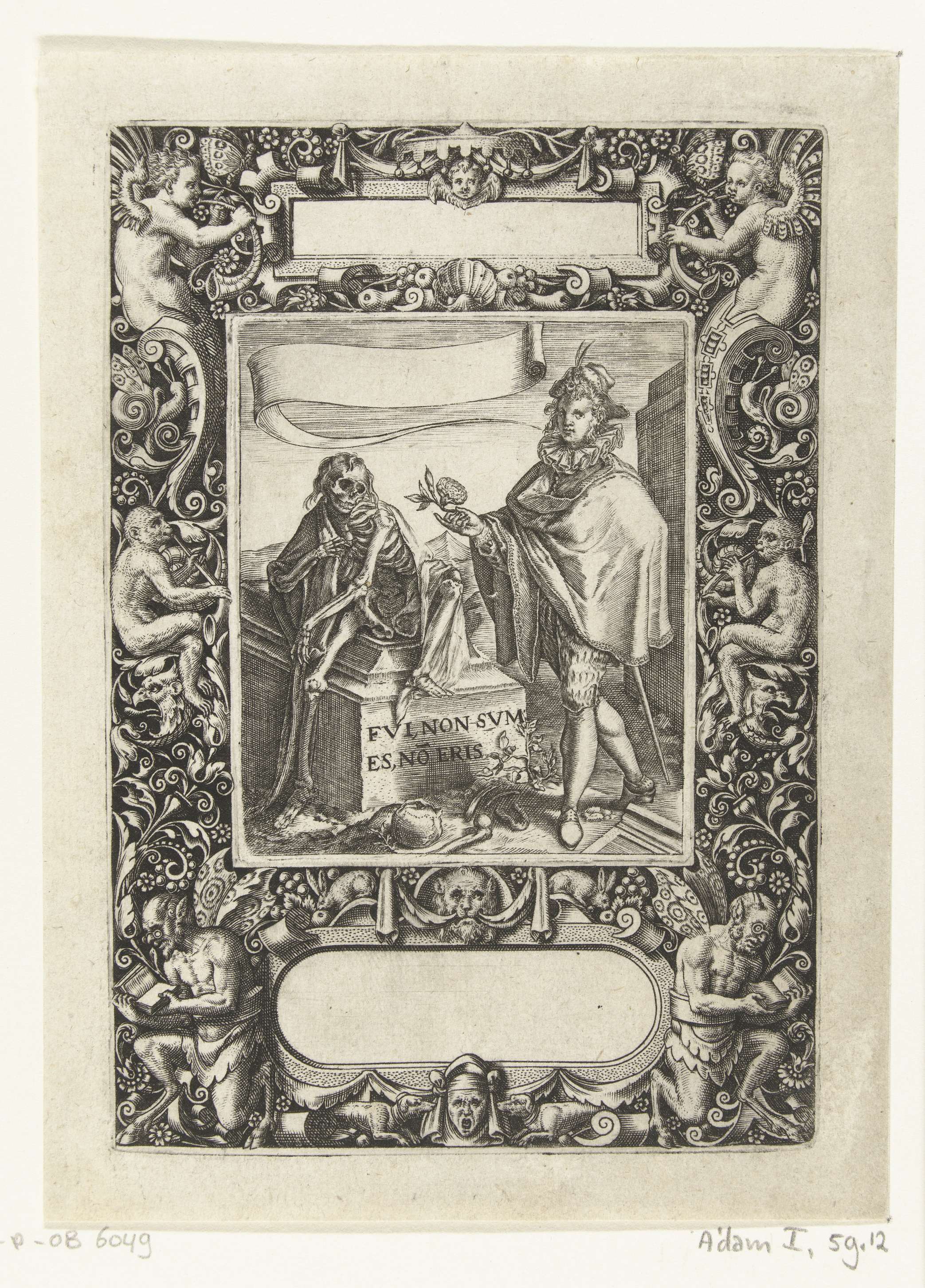 Smalle rechthoekige cartouche middenboven en een cartouche met ronde zijkanten middenonder. Linksboven en rechtsboven rijst een trompetspelend engeltje op uit een voluut. Hoort bij een serie van 18 bladen waarbij in het midden van aparte platen zevenentwintig emblemata en vijfenveertig wapenschilden zijn gedrukt. De emblemata zijn ten dele genummerd A-D, 1-7 en 9-21. Drie bladen ...