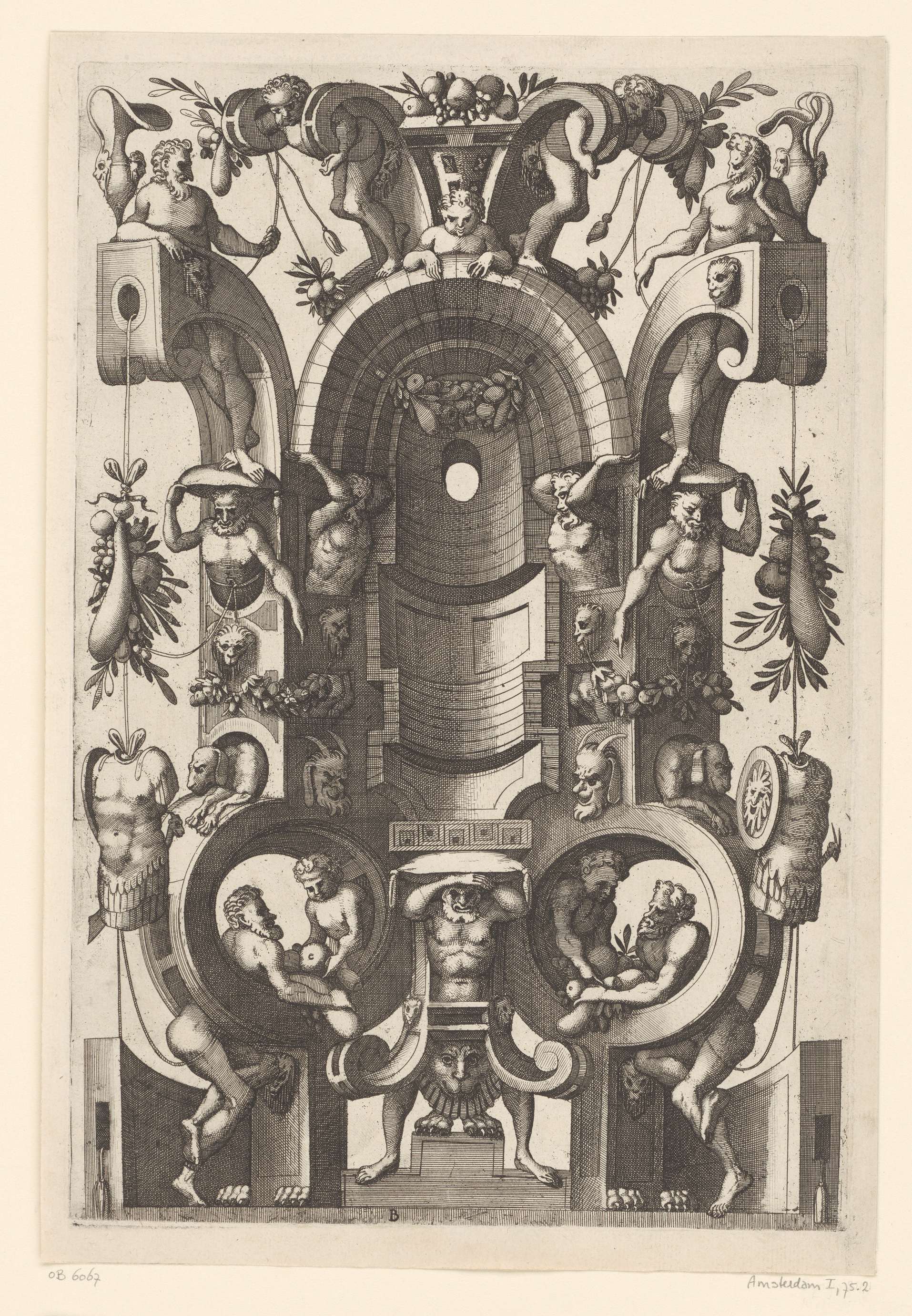 Aan weerszijden van atlant rolwerk met voluut waar een man doorheen leunt. In de voluut een kind. Blad B afkomstig uit serie van 12 bladen, genummerd A-M met vlakdecoraties van grotesken met rolwerk, saters, guirlandes, trofeeën, dieren en fantasiewezens.