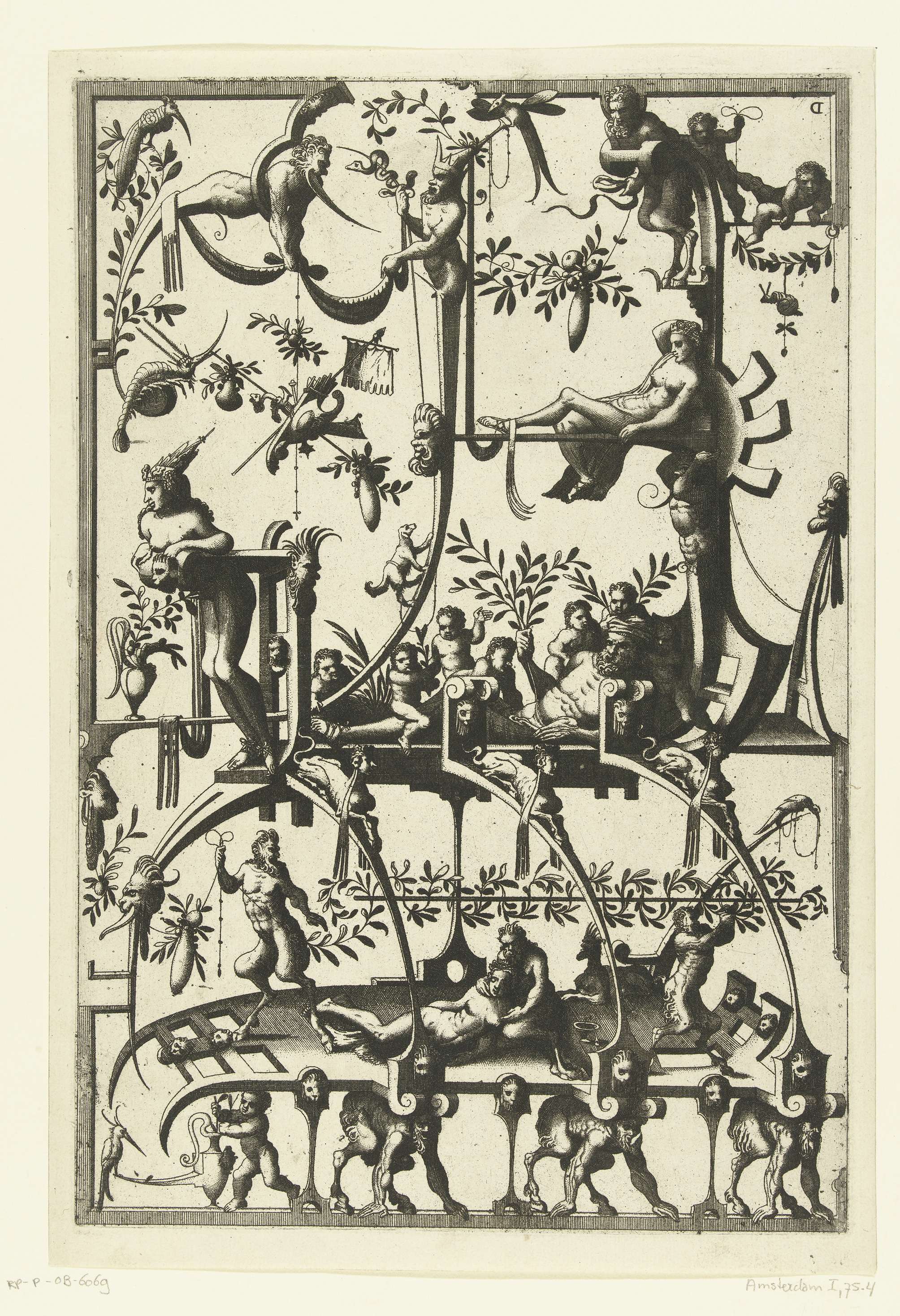 Op het onderste niveau liggen een sater en een bacchante, daarboven ligt een god omringd door kindertjes. Blad D uit serie van 12 bladen, genummerd A-M met vlakdecoraties van grotesken met rolwerk, saters, guirlandes, trofeeën, dieren en fantasiewezens.