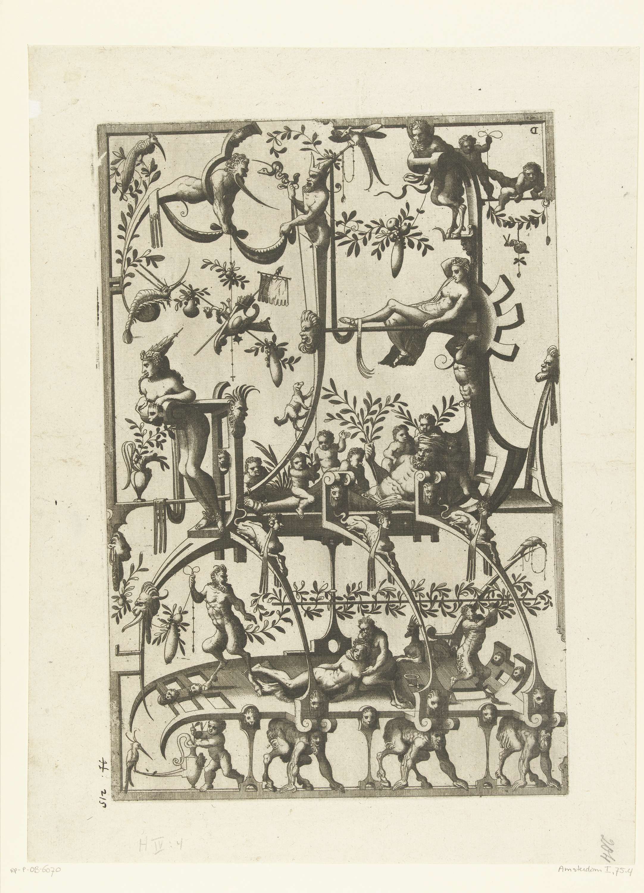 Op het onderste niveau liggen een sater en een bacchante, daarboven ligt een god omringd door kindertjes. Blad D uit serie van 12 bladen, genummerd A-M met Vlakdecoraties: grotesken met rolwerk, saters, guirlandes, trofeeën, dieren en fantasiewezens.