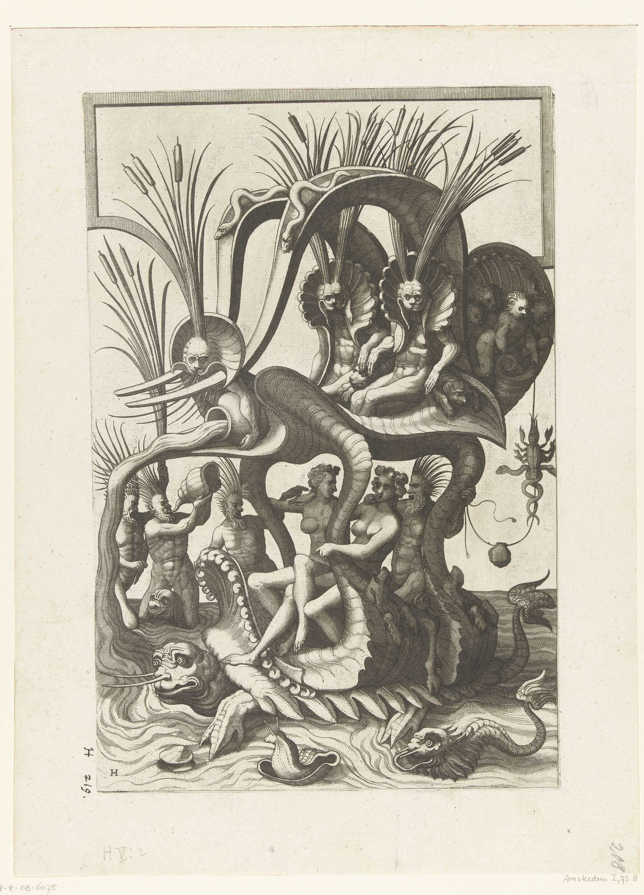 In de wagen zitten twee vrouwen en een sater. Boven hen zitten twee figuren met schelpvormige kragen en lisdodden op hun hoofd. Blad H uit serie van 12 bladen, genummerd A-M met vlakdecoraties van grotesken met rolwerk, saters, guirlandes, trofeeën, dieren en fantasiewezens