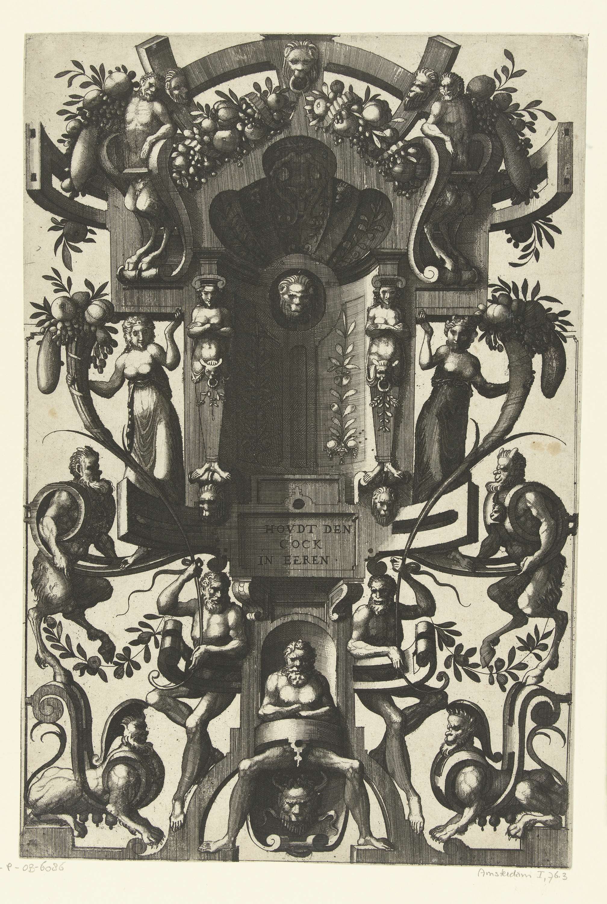Nis, geflankeerd door vrouwelijke hermen, waarboven guirlandes van vruchten. Onder de nis hangt een cartouche met de tekst HOUDT DEN COCK IN EEREN. Daaronder zitten drie mannen gevangen in het rolwerk. De man aan de buitenzijden houden een hoorn des overvloeds omhoog. De middelste man zit wijdbeens: onder zijn benen een masker. Hoort bij serie ...