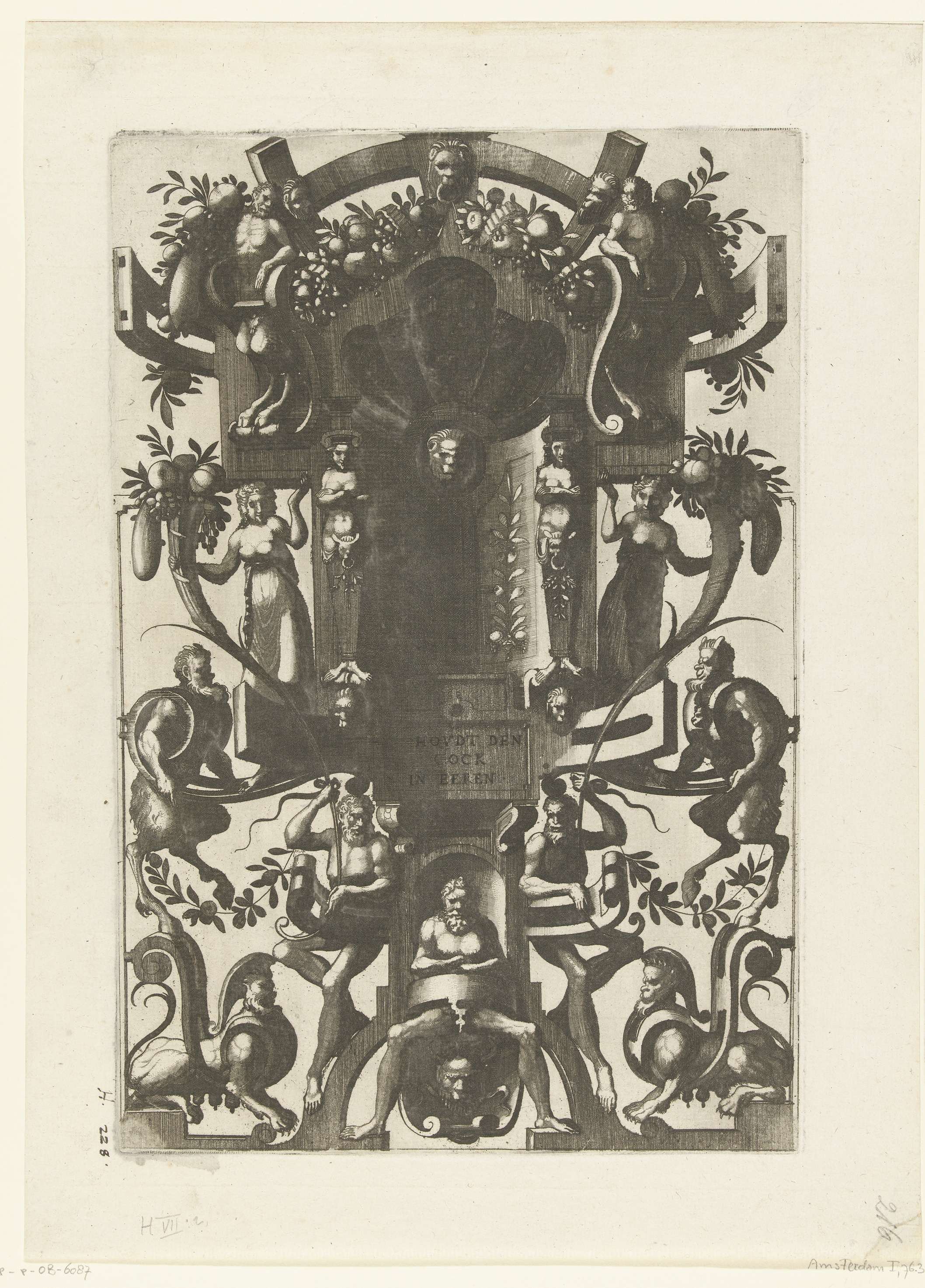 Nis, geflankeerd door vrouwelijke hermen, waarboven guirlandes van vruchten. Onder de nis hangt een cartouche met de tekst HOUDT DEN COCK IN EEREN. Daaronder zitten drie mannen gevangen in het rolwerk. De man aan de buitenzijden houden een hoorn des overvloeds omhoog. De middelste man zit wijdbeens: onder zijn benen een masker. Hoort bij serie ...