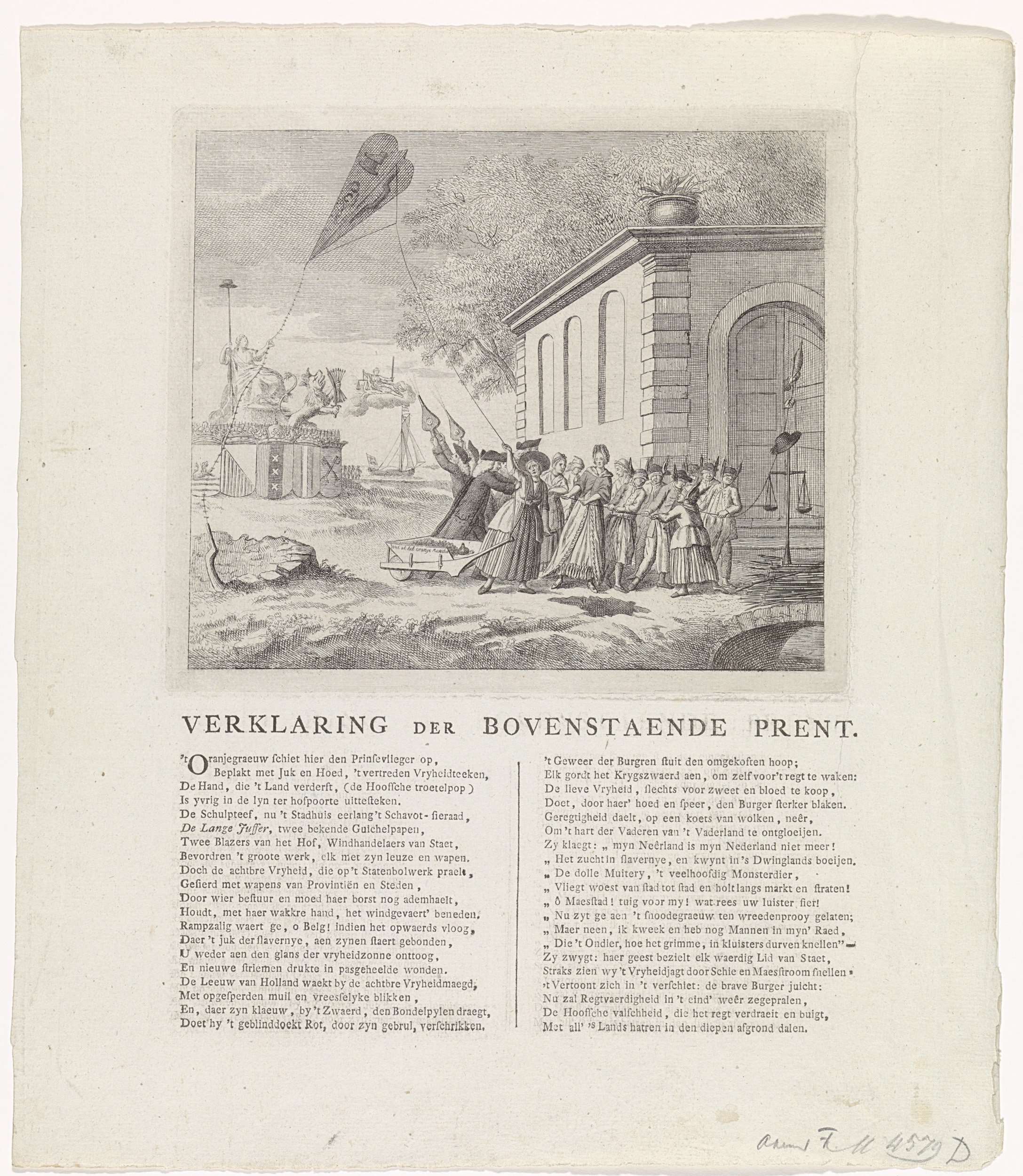 Oranjegezinden uit Rotterdam, onder wie Kaat Mossel naast een mosselwagen, trachten de prinsgezinde vlieger op te laten. Links zit de personificatie van de vrijheid met vrijheidslans boven de wapens van Zeeland, Utrecht, Amsterdam, Delft en Leiden, en houdt de vlieger aan de staart vast. Rechts van de vrijheid staat de Hollandse leeuw. De personificatie van ...