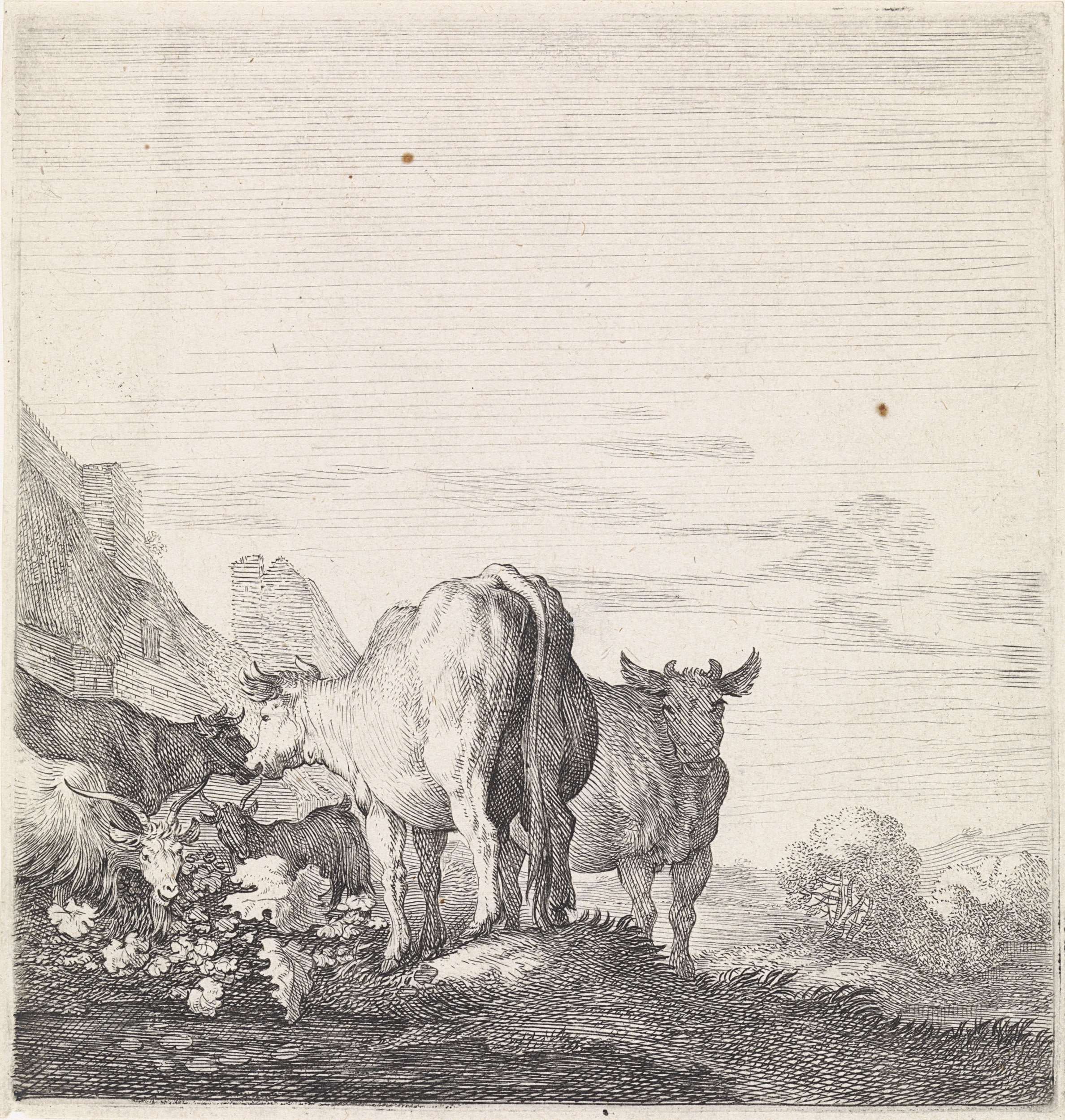 Koeien en geiten in een landschap met huizen