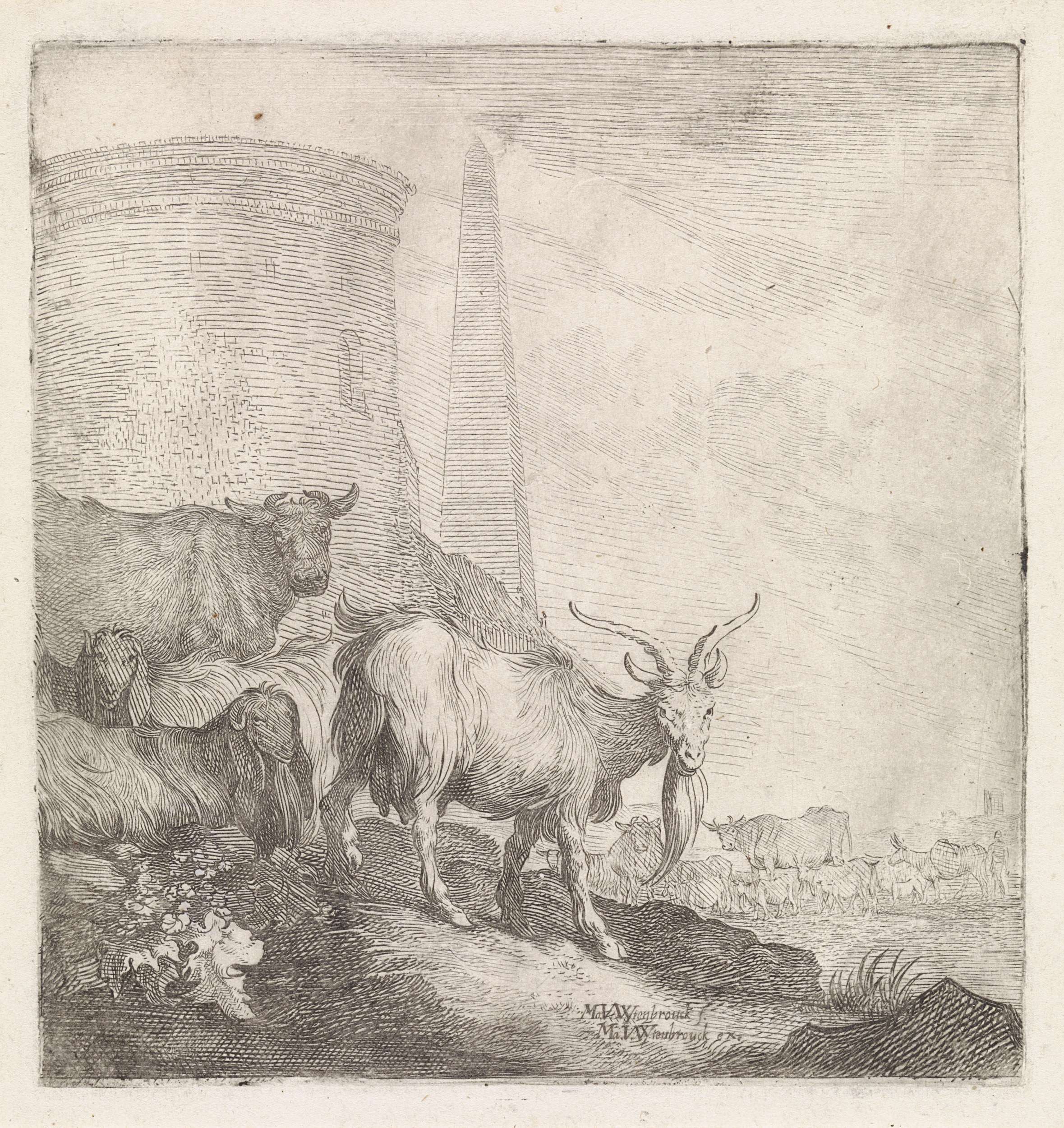Geiten en koeien bij een ronde toren met een obelisk
