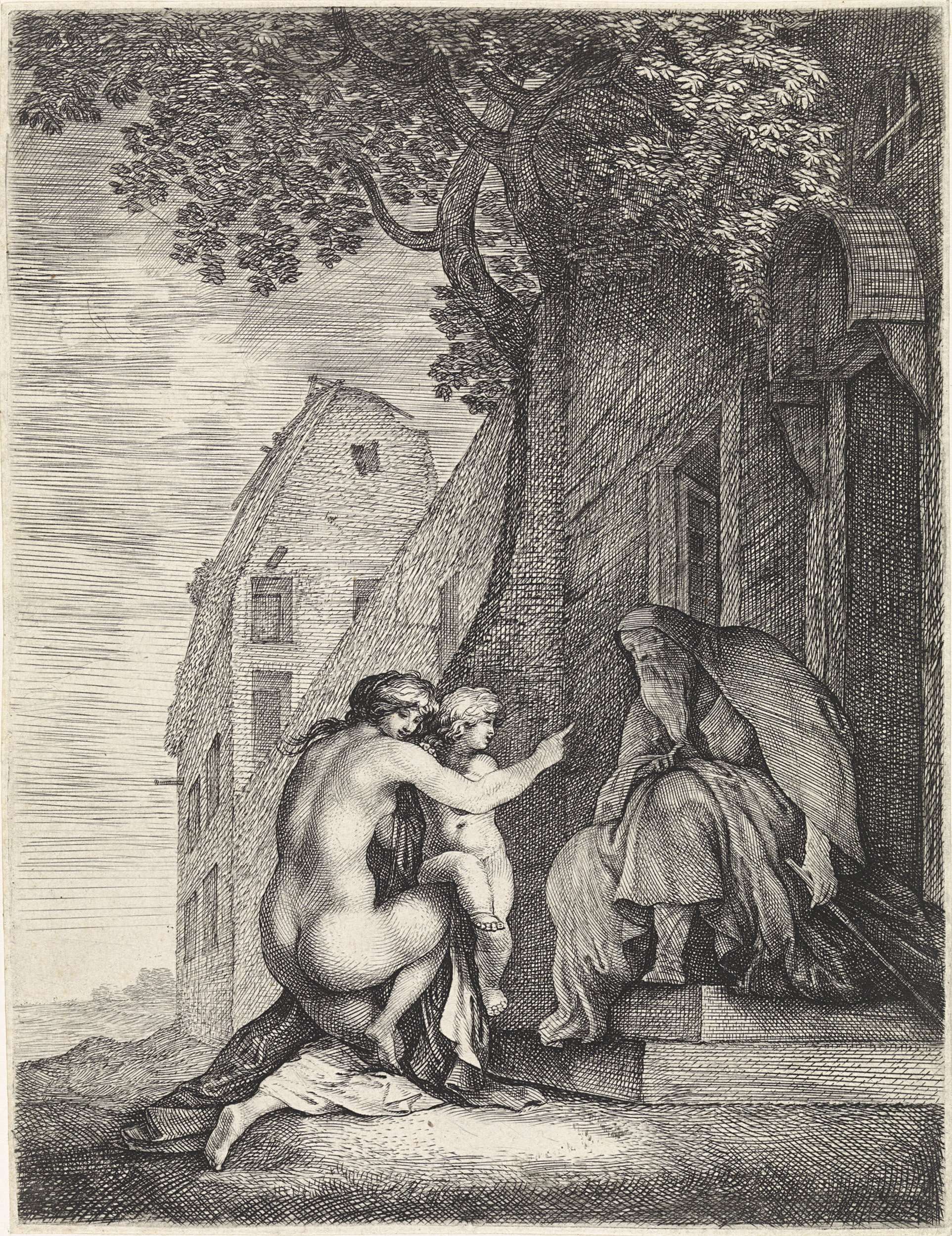 Een knielende, naakte vrouw met een kind wijst naar een oude man met lange baard. Hij zit op een stoepje voor een huis.
