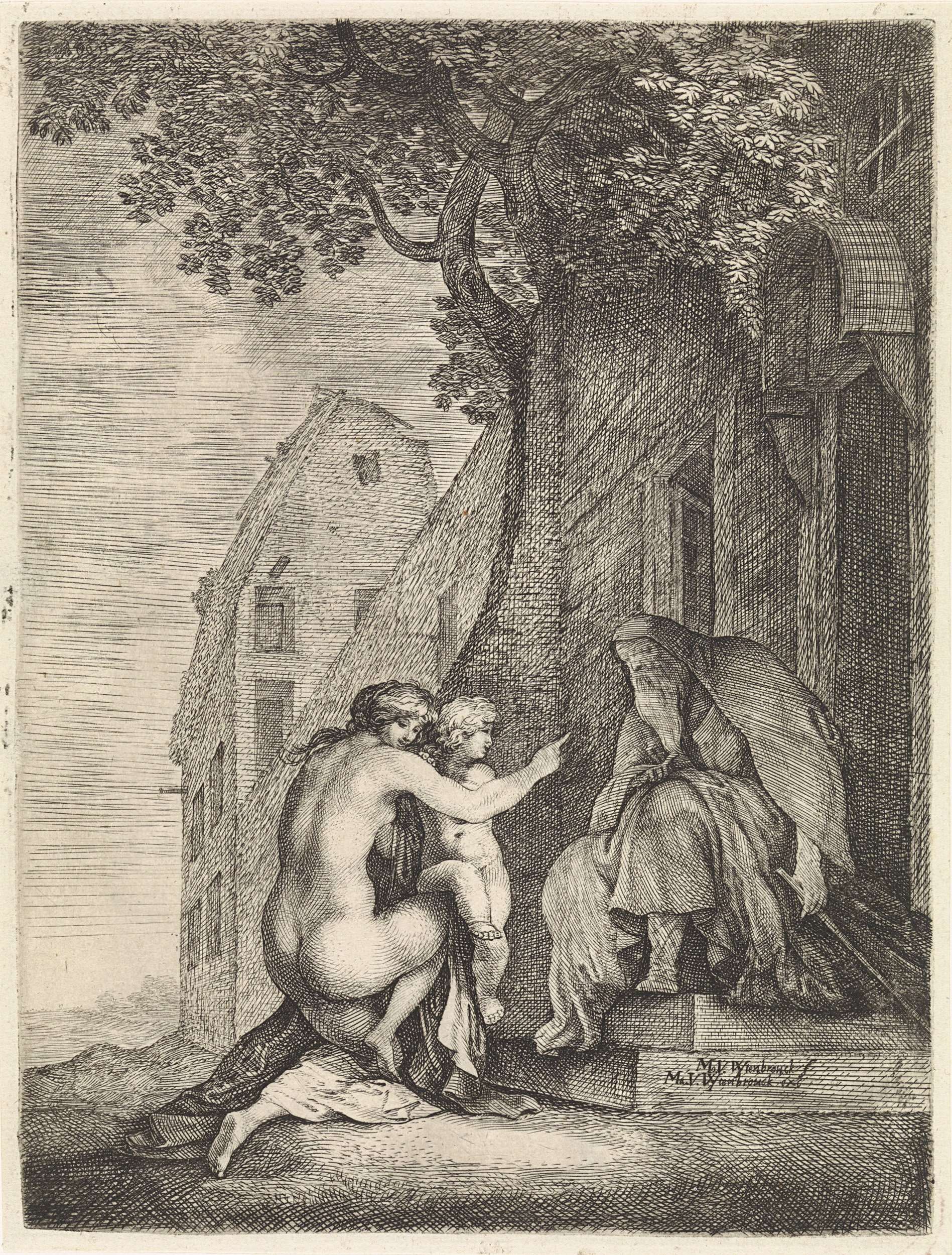 Een knielende, naakte vrouw met een kind wijst naar een oude man met lange baard. Hij zit op een stoepje voor een huis.