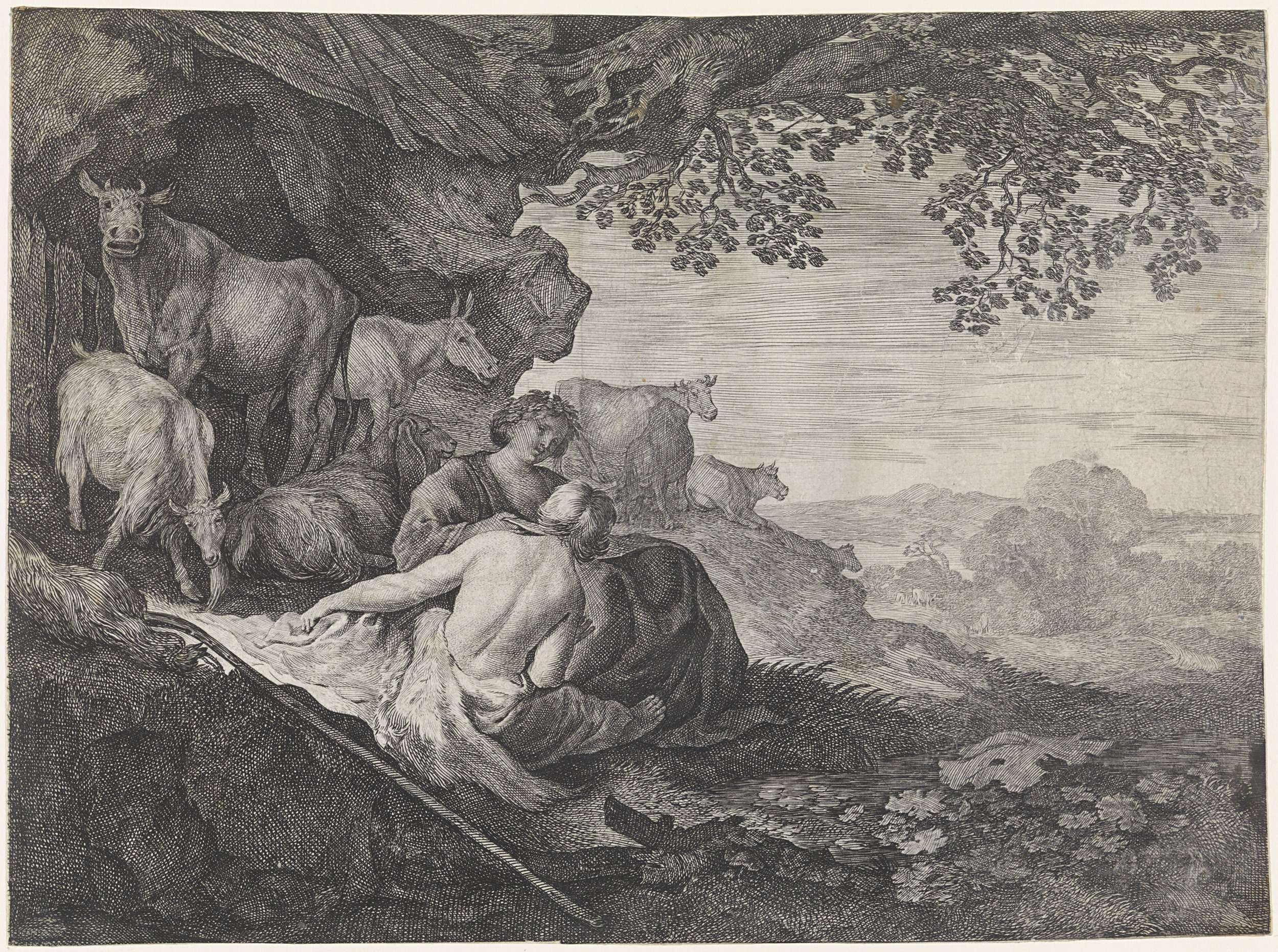 Een herder, op de rug gezien, zit bij een herderin, die naar een vel papier op haar schoot kijkt. De herdersstaf ligt op de grond, hun kudde staat achter hen.