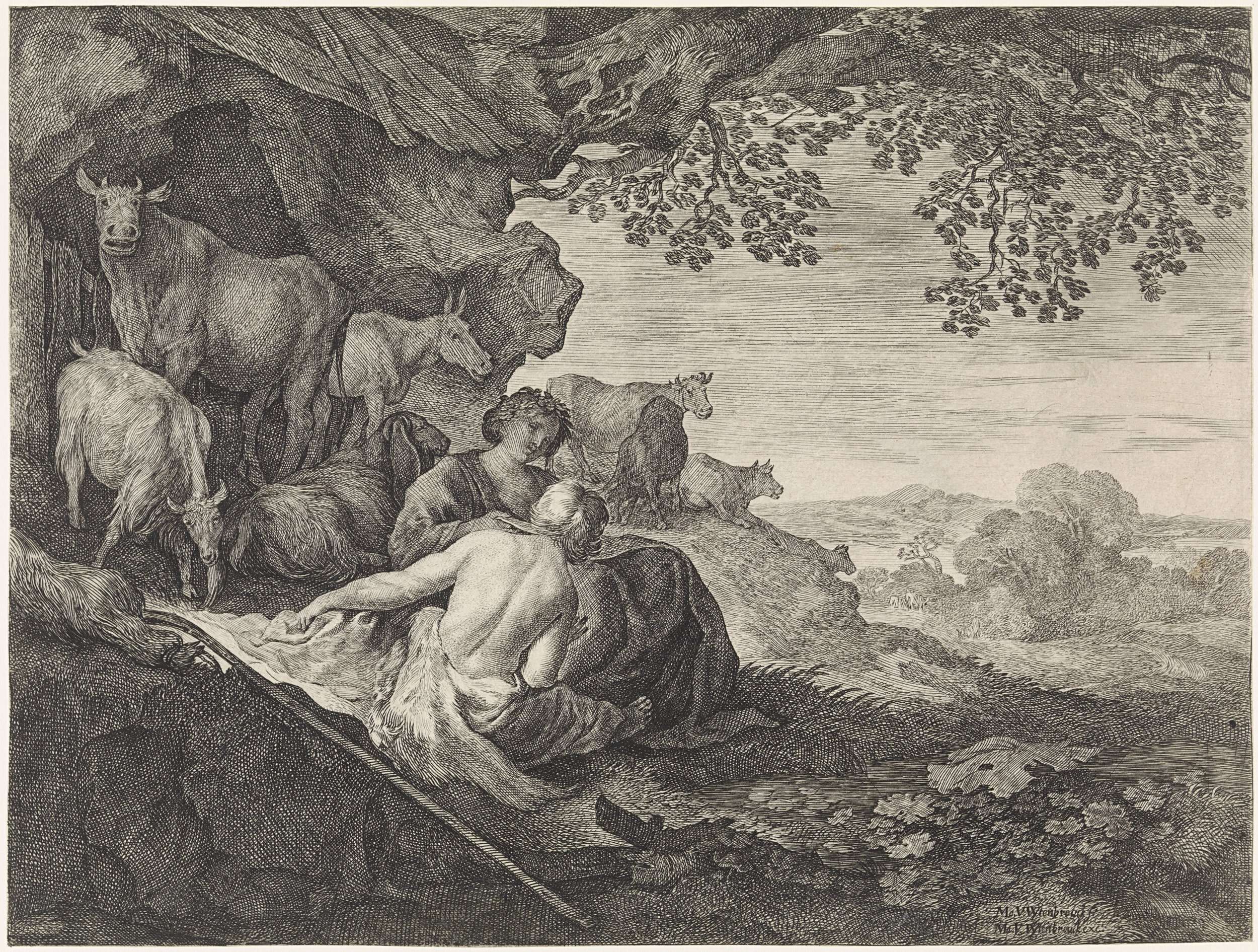 Een herder, op de rug gezien, zit bij een herderin, die naar een vel papier op haar schoot kijkt. De herdersstaf ligt op de grond, hun kudde staat achter hen.