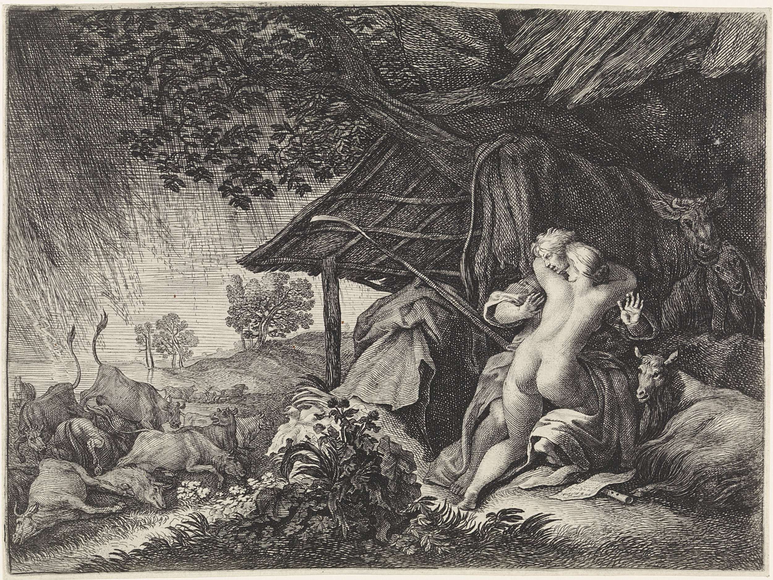 De herder en herderin schuilen onder een afdak in elkaars armen voor een hevige storm. Op de grond een fluit en bladmuziek. Een kudde koeien, over elkaar heen vallend, vlucht in paniek.