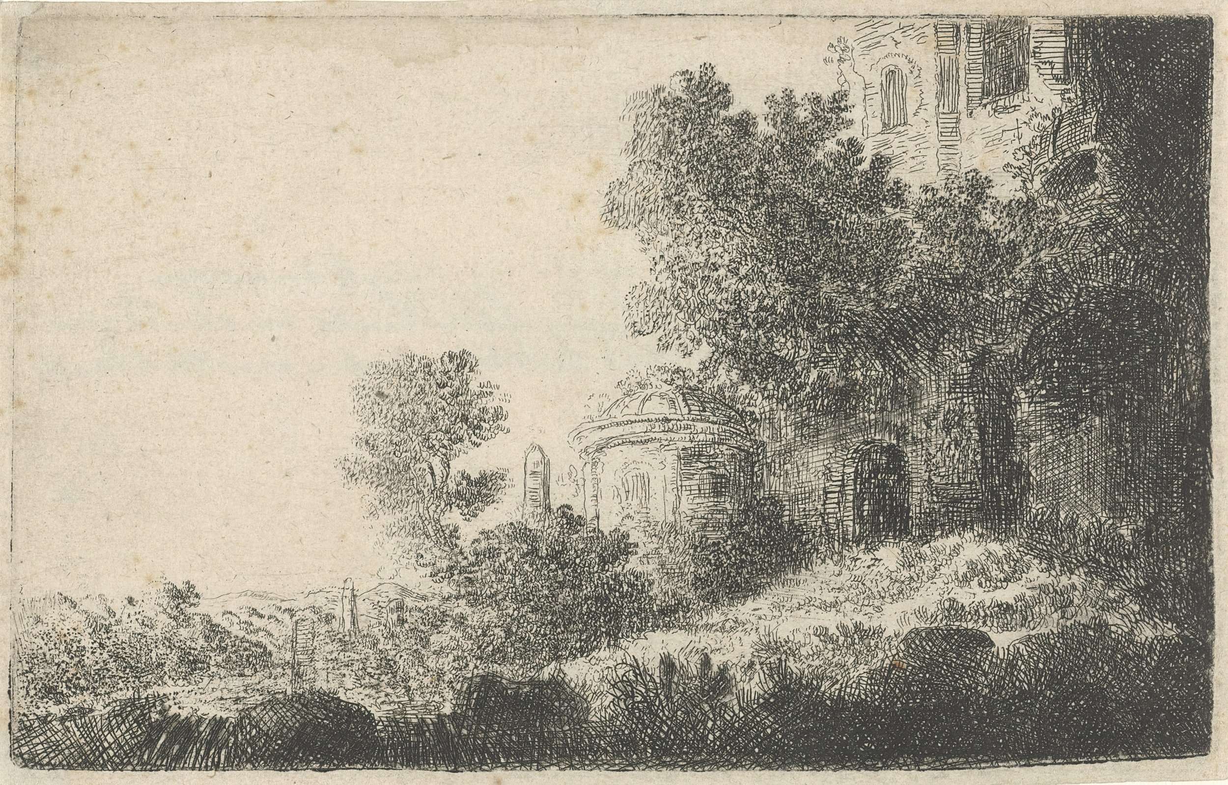 Landschap met rechts enkele gebouwen op een heuvel. In de achtergrond een obelisk.