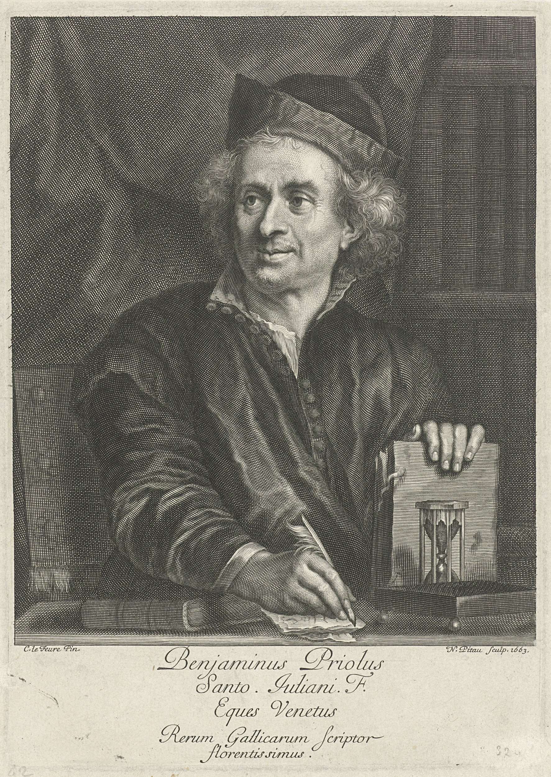 Portret van de Italiaanse historicus Benjamin Priolo. Hij zit in zijn studeervertrek en schrijft op een vel papier. In de marge een vijfregelig onderschrift in het Latijn.