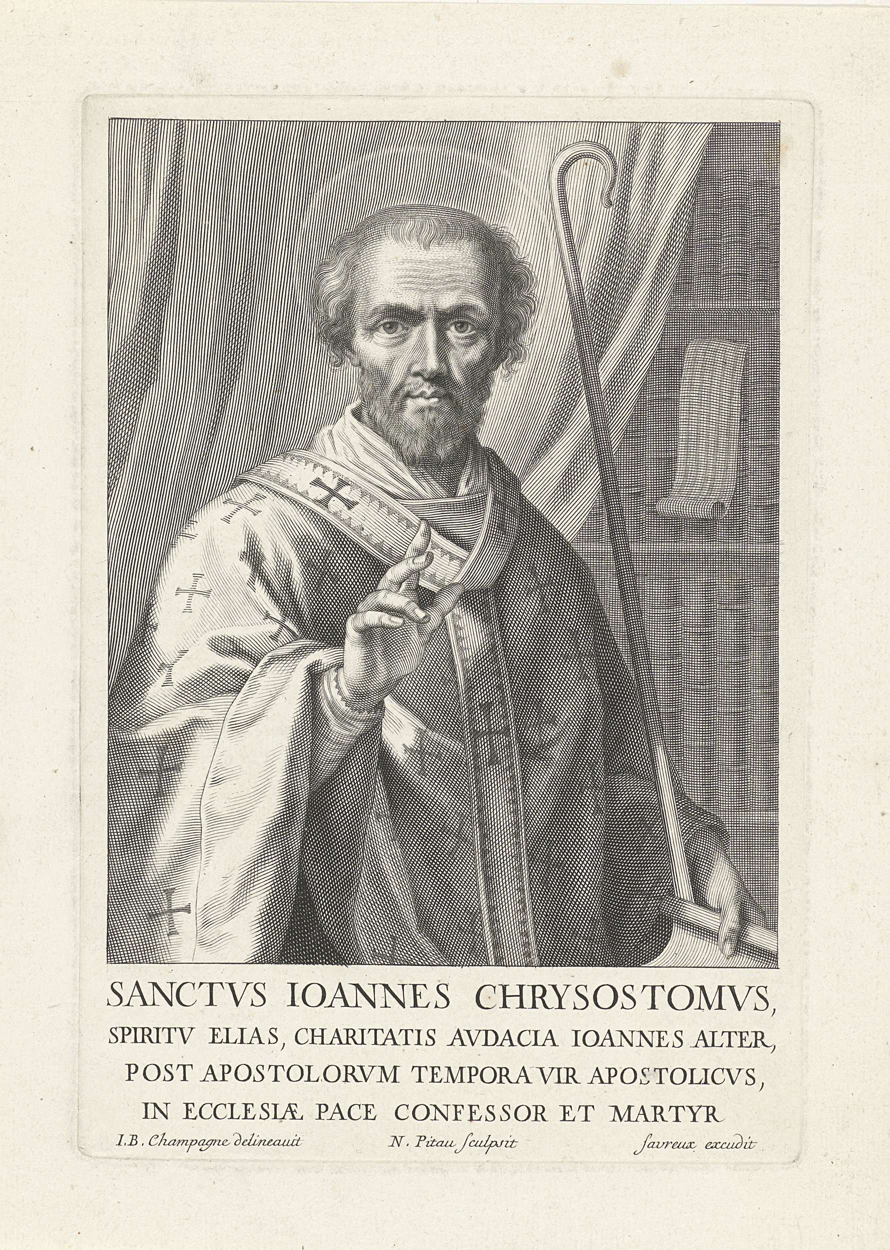 Portret van de heilige Johannes Chrysostomus, prediker en kerkleraar. Hij was tevens aartsbisschop van Constantinopel. Hij staat in een studeervertrek en maakt een zegenend gebaar. In de marge een vierregelig onderschrift in het Latijn.