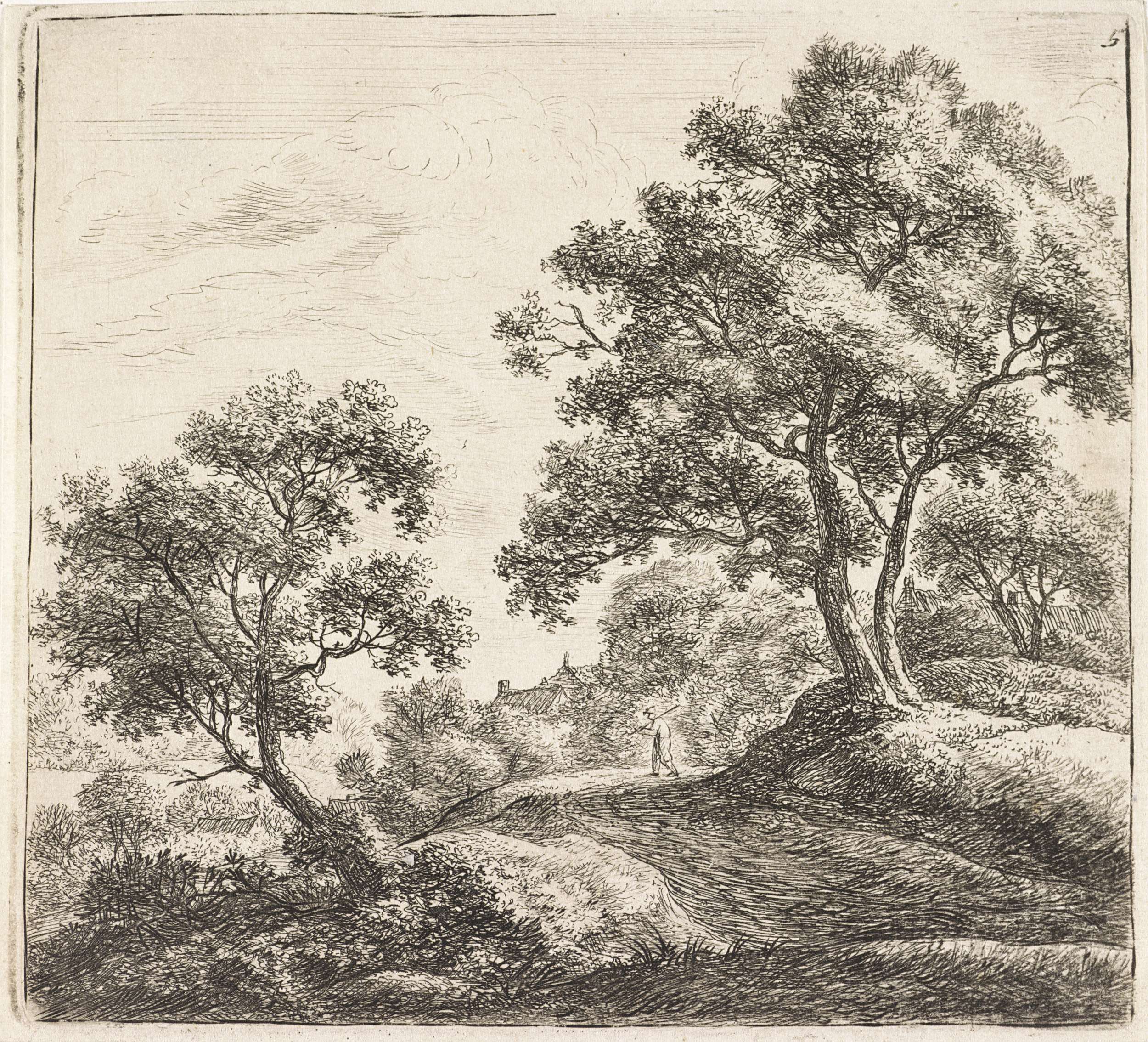 Een man loopt op een pad met aan weerszijden bomen. In de verte ligt een dorp.