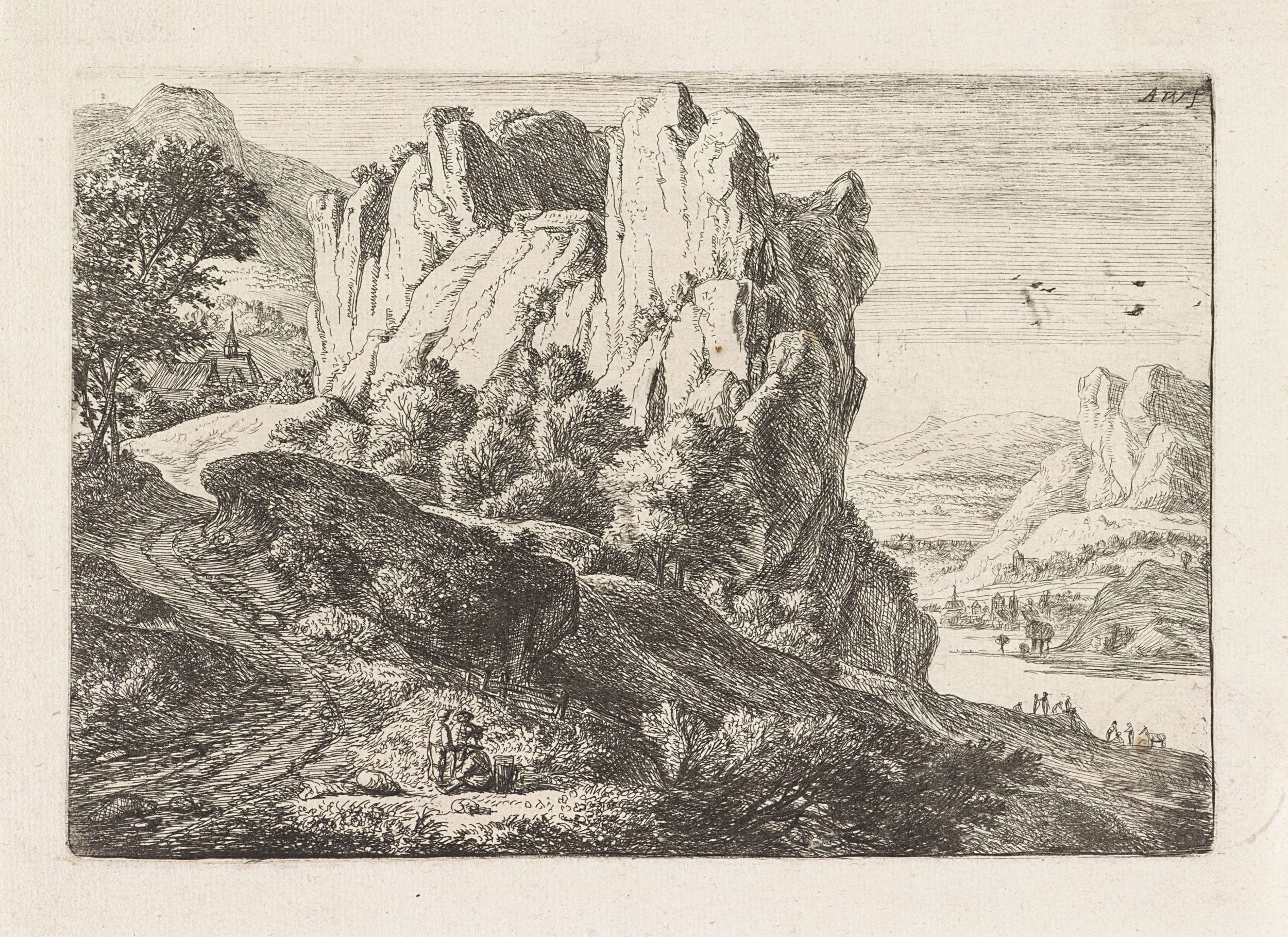 Links leidt een steil pad langs een grote rotspartij naar een kleine kerk of kapel. Langs het pad zijn drie figuren weergegeven. Rechts staan nog enkele figuren aan de oever van een rivier. In de verte ligt een dorp.