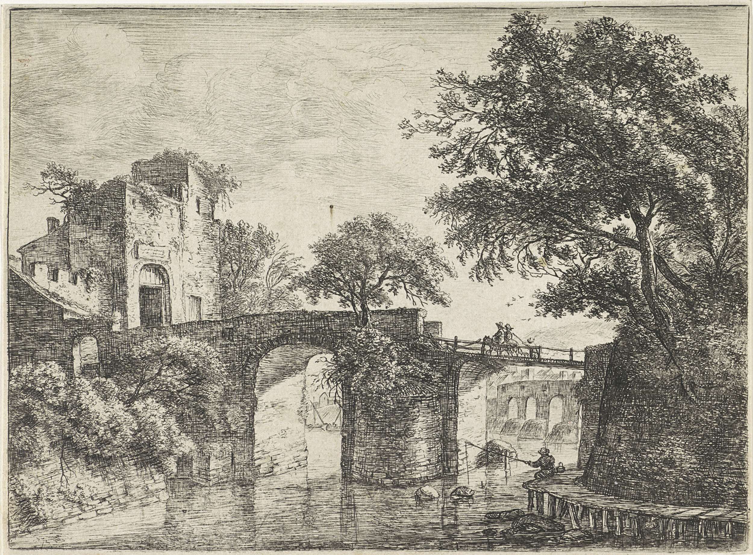 Er zijn twee stenen bruggen over een rivier te zien. Op de voorste brug rijden twee ruiters in de richting van een toegangspoort. Rechtsvoor zit een man op een houten steiger te vissen.