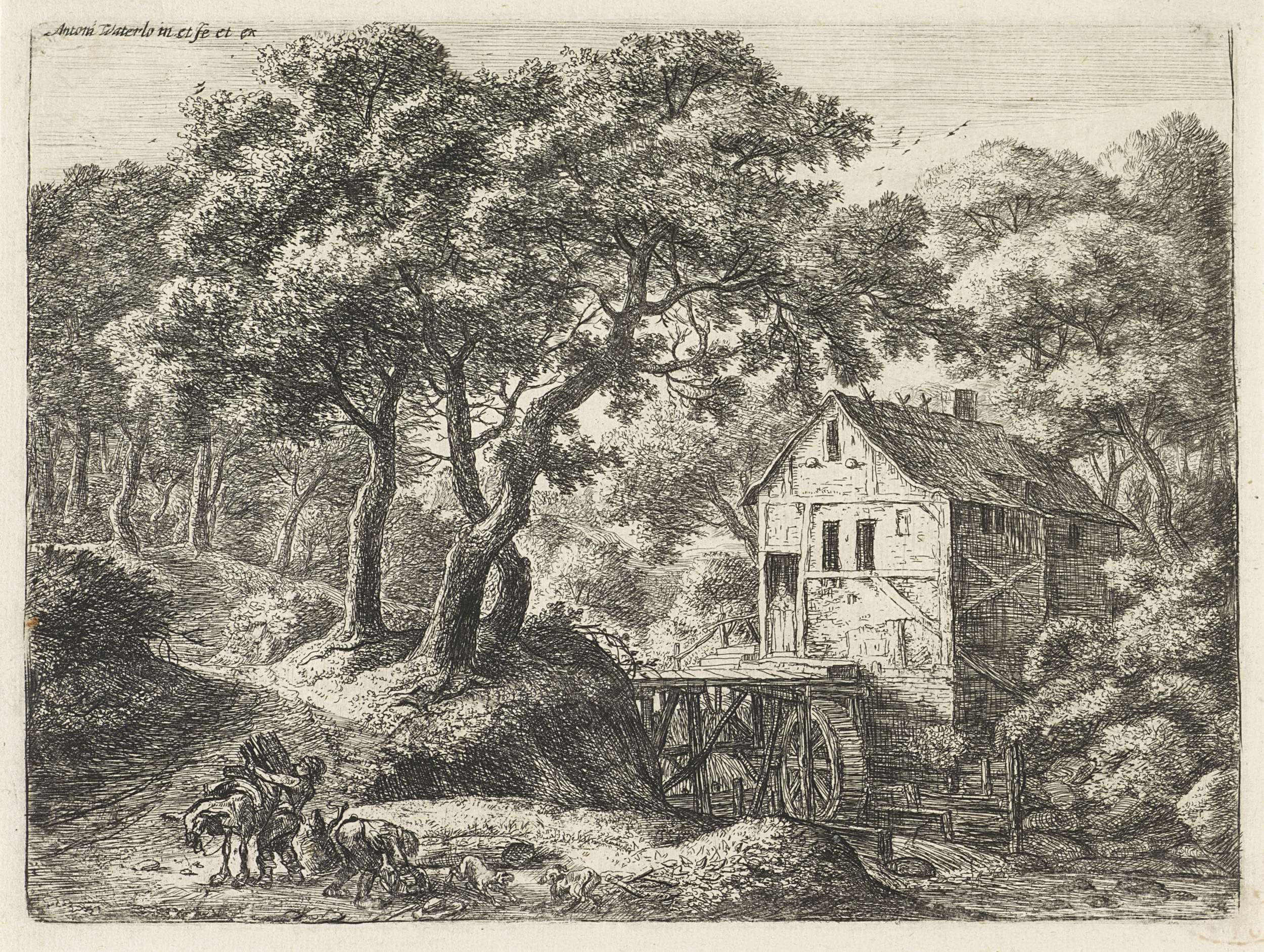 Er is een bos afgebeeld. Rechts staat een watermolen. In de deuropening van het gebouw ernaast staat een figuur. Links verzamelen twee jonge mannen kreupelhout bij een bospad. Eén van hen legt het hout op een ezel. Rechts van hen spelen twee honden.