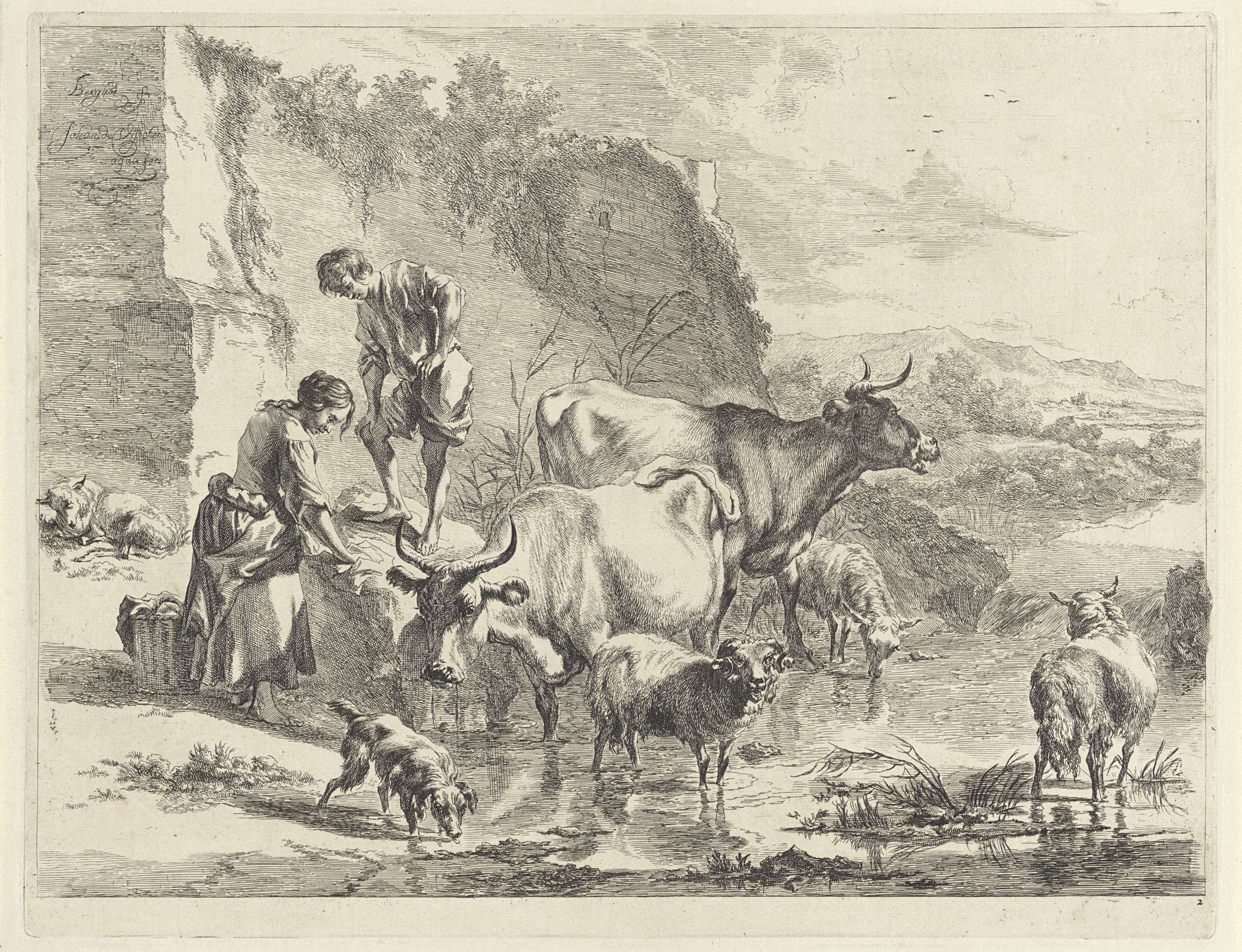 Gezicht op een landschap met op de voorgrond een beek waar een jonge vrouw haar was op een steen te drogen legt. Een herdersjongen staat op de steen en kijkt toe, zijn vee staat in het water. Op de voorgrond een hondje dat water drinkt uit de beek.