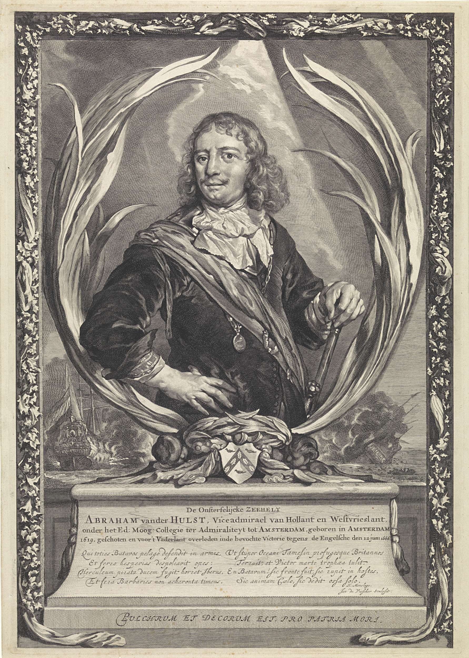 De admiraal Abraham van der Hulst, met in zijn hand een commandostaf, gevat in een omlijsting van palmbladeren. Op de achtergrond de zeeslag waarin hij het leven liet. Onder de afbeelding zijn naam en functie, en een lofdicht in het Latijn.