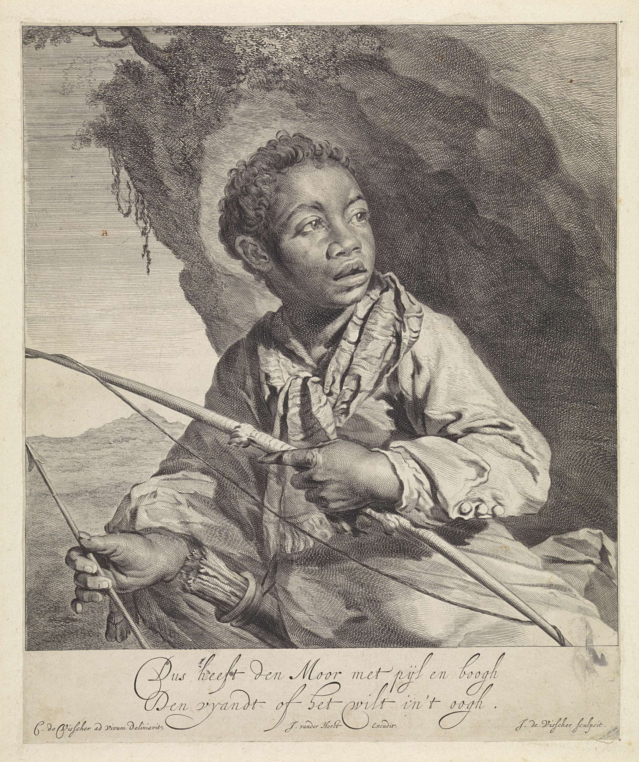 Een jonge Afrikaan met een pijl en boog voor een rots. Op de achtergrond een landschap.