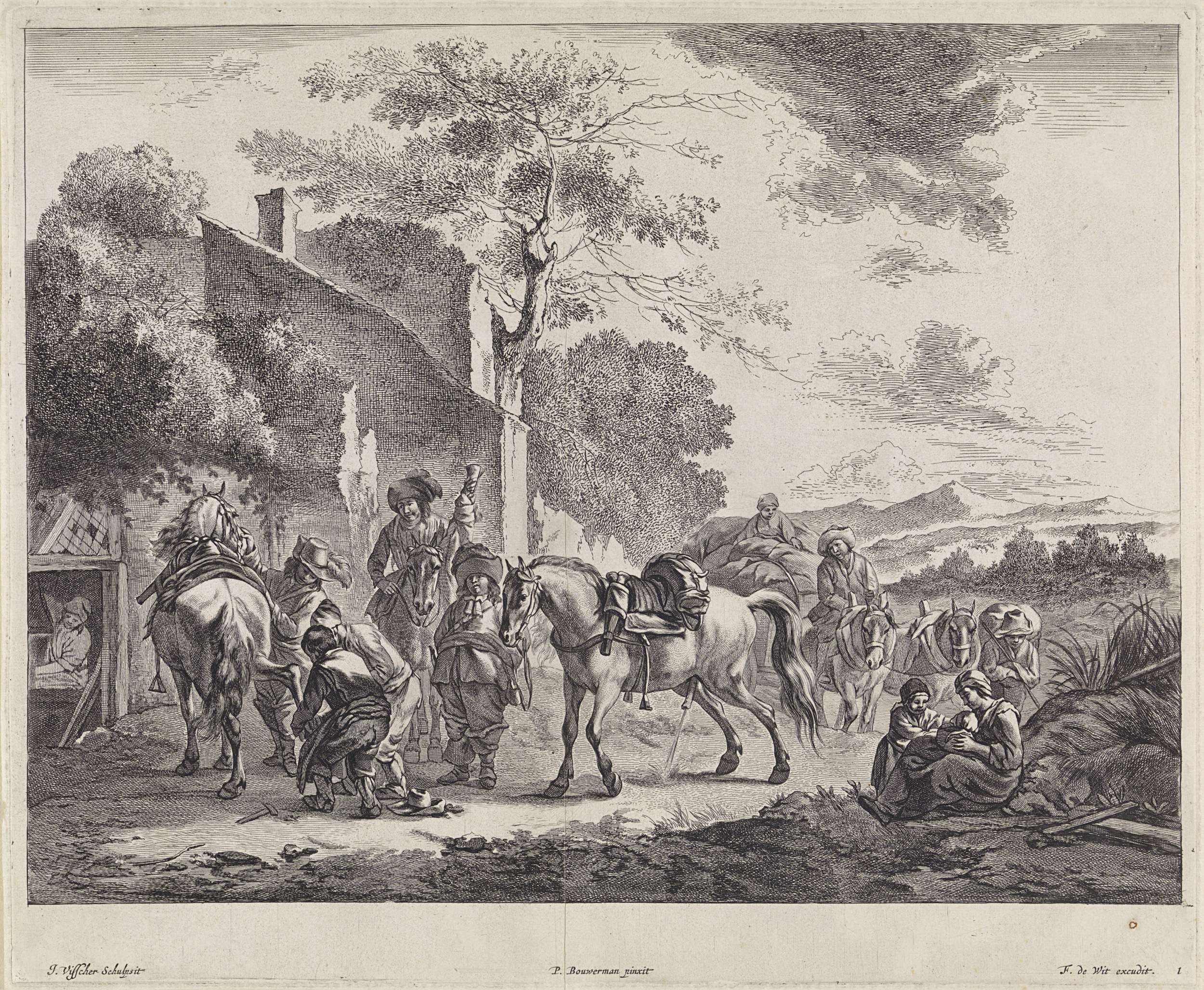 In een heuvellandschap voor een groep woningen beslaat een hoefsmid de hoef van een paard terwijl de ruiter toekijkt. Een tweede man staat met zijn plassende paard bij de hoefsmid te wachten.