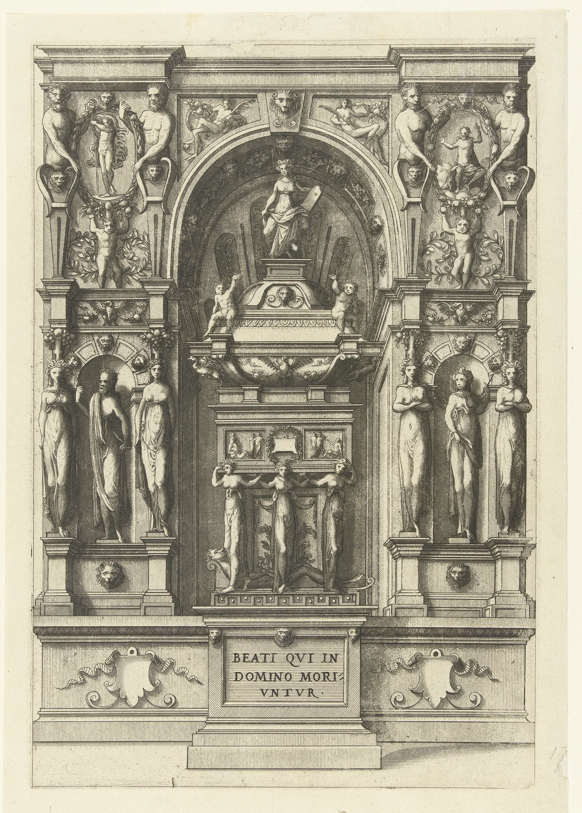 Op een sokkel met een vooruitspringende middenrisaliet staat een dubbel gelede wand, gedecoreerd met figuren en grotesken, ter weerszijden van een nis. In de nis een sarcofaag op een voetstuk, gedragen door drie kariatiden. Op het deksel zit een vrouw met een tablet. Middenonder in cartouche: BEATI QUI IN / DOMINI MORI / UNTUR. Hoort ...