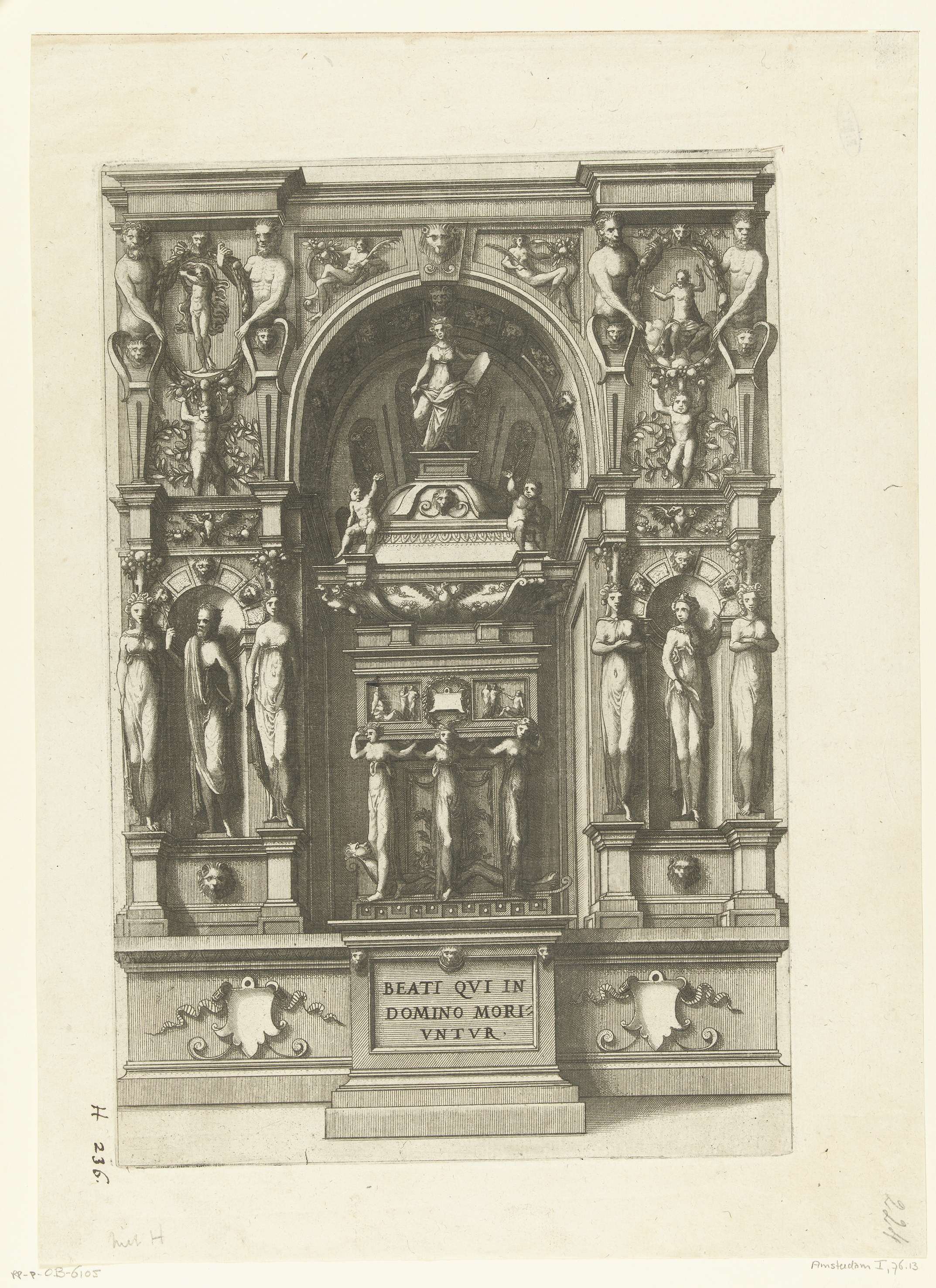 Op een sokkel met een vooruitspringende middenrisaliet staat een dubbel gelede wand, gedecoreerd met figuren en grotesken, ter weerszijden van een nis. In de nis een sarcofaag op een voetstuk, gedragen door drie kariatiden. Op het deksel zit een vrouw met een tablet. Middenonder in cartouche: BEATI QUI IN / DOMINI MORI / UNTUR. Hoort ...