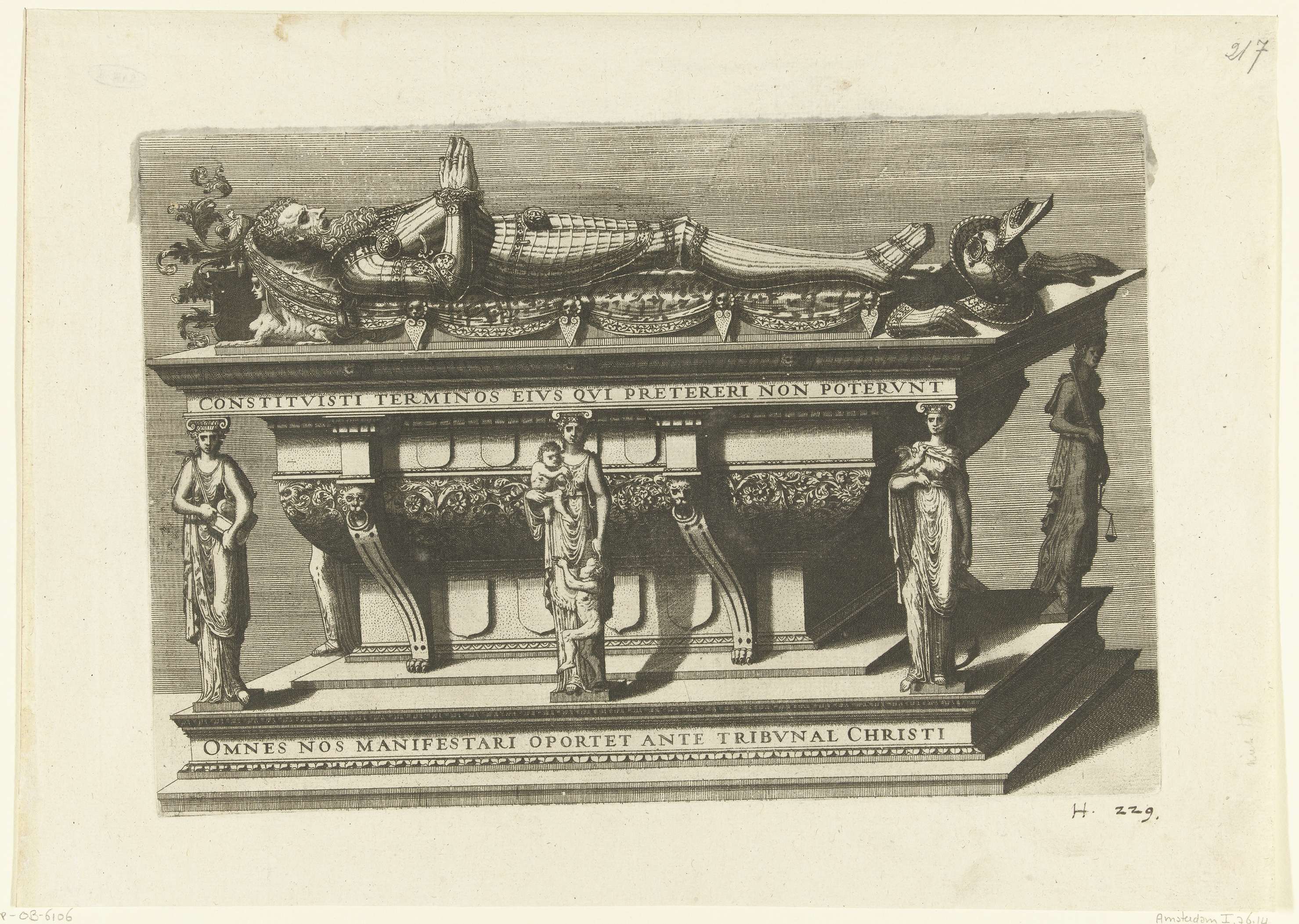 Vrijstaand grafmonument. Op de overstekende dekplaat van een sarcofaag, gesteund door kariatiden, ligt de opgebaard vorst. Met opschrift op grafmonument (onder dekplaat) CONSTITVISTI TERMINOS ....ANTE TRIBVNAL CHRISTI (op basement). Hoort bij serie bestaande uit een titelblad, een tekstblad en 14 bladen met grotesken met rolwerk, saters, guirlandes, trofeeën, dieren en fantasiewezens.