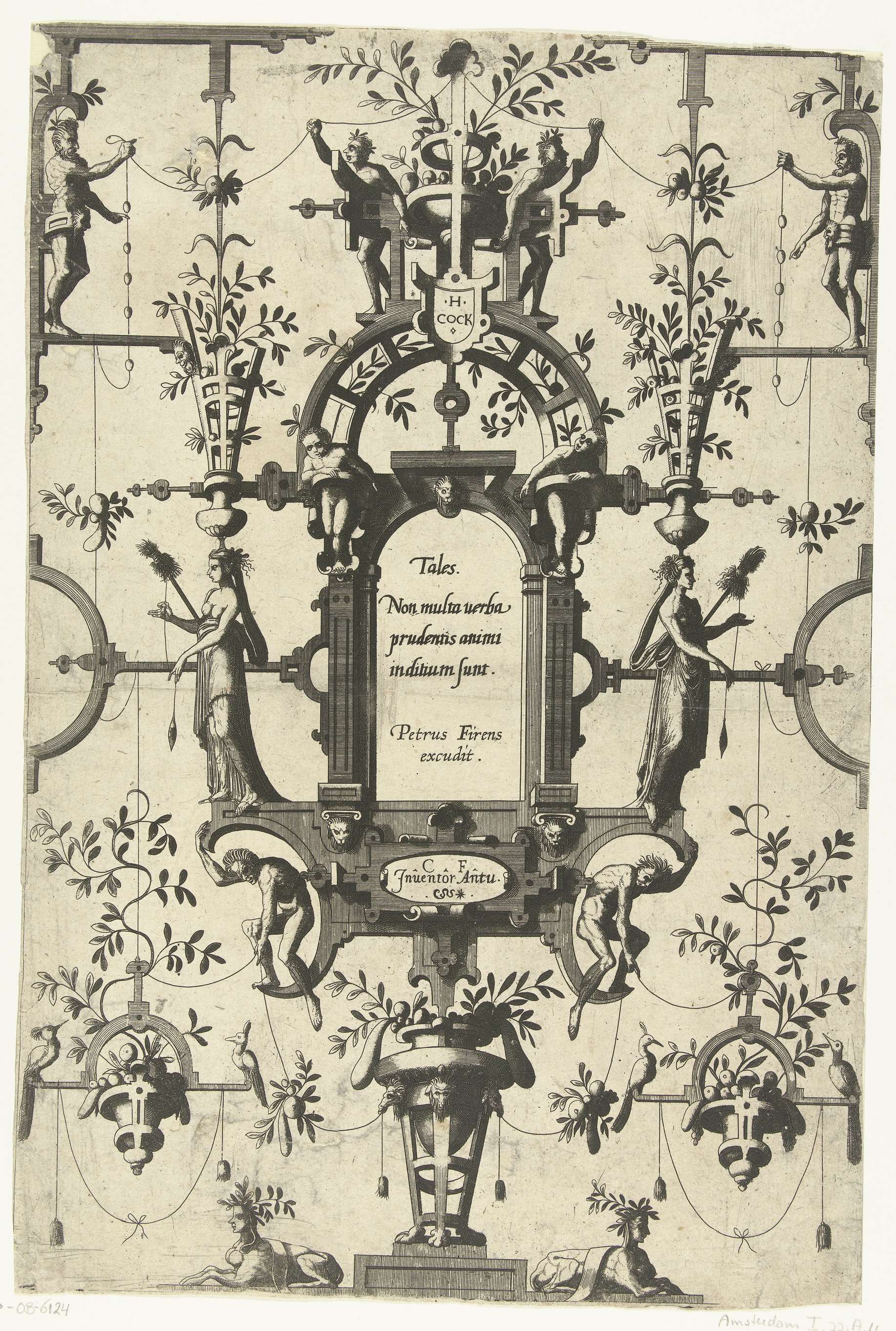 Cartouche met tekst, geflankeerd door twee vrouwen met spinrokken. Onderaan liggen twee sfinxen. Eén van 4 bladen uit een serie van 6. Tweede editie van een serie vlakdecoraties ontworpen door Cornelis Floris (Orn Cat I-77.1 t/m 77.6).