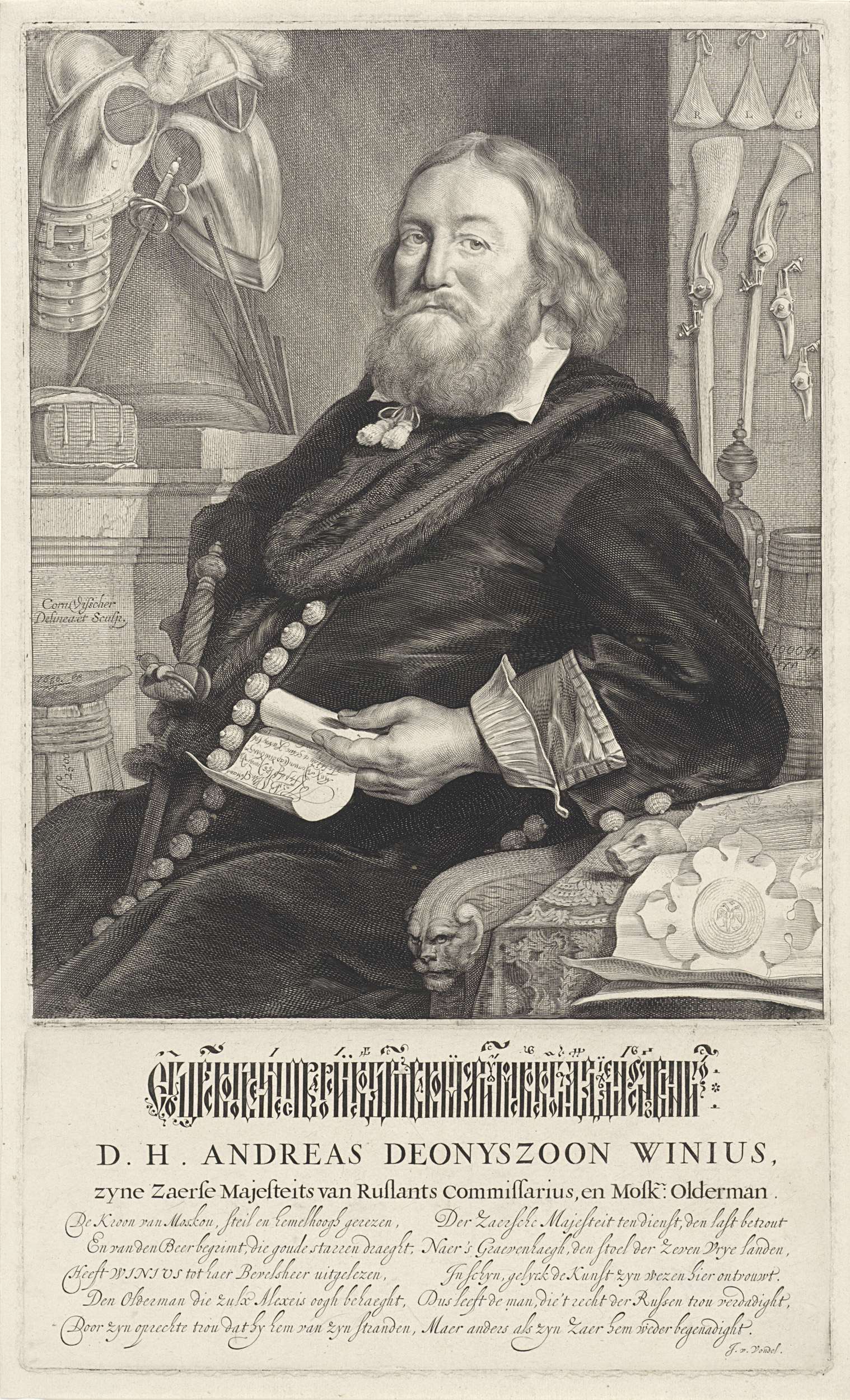 Andreas Deonyszoon Winius, ook wel 'l'homme au pistolet' genoemd, postmeester van de tsaar. Achter hem twee wapenrustingen en enkele wapens. In zijn hand een brief.