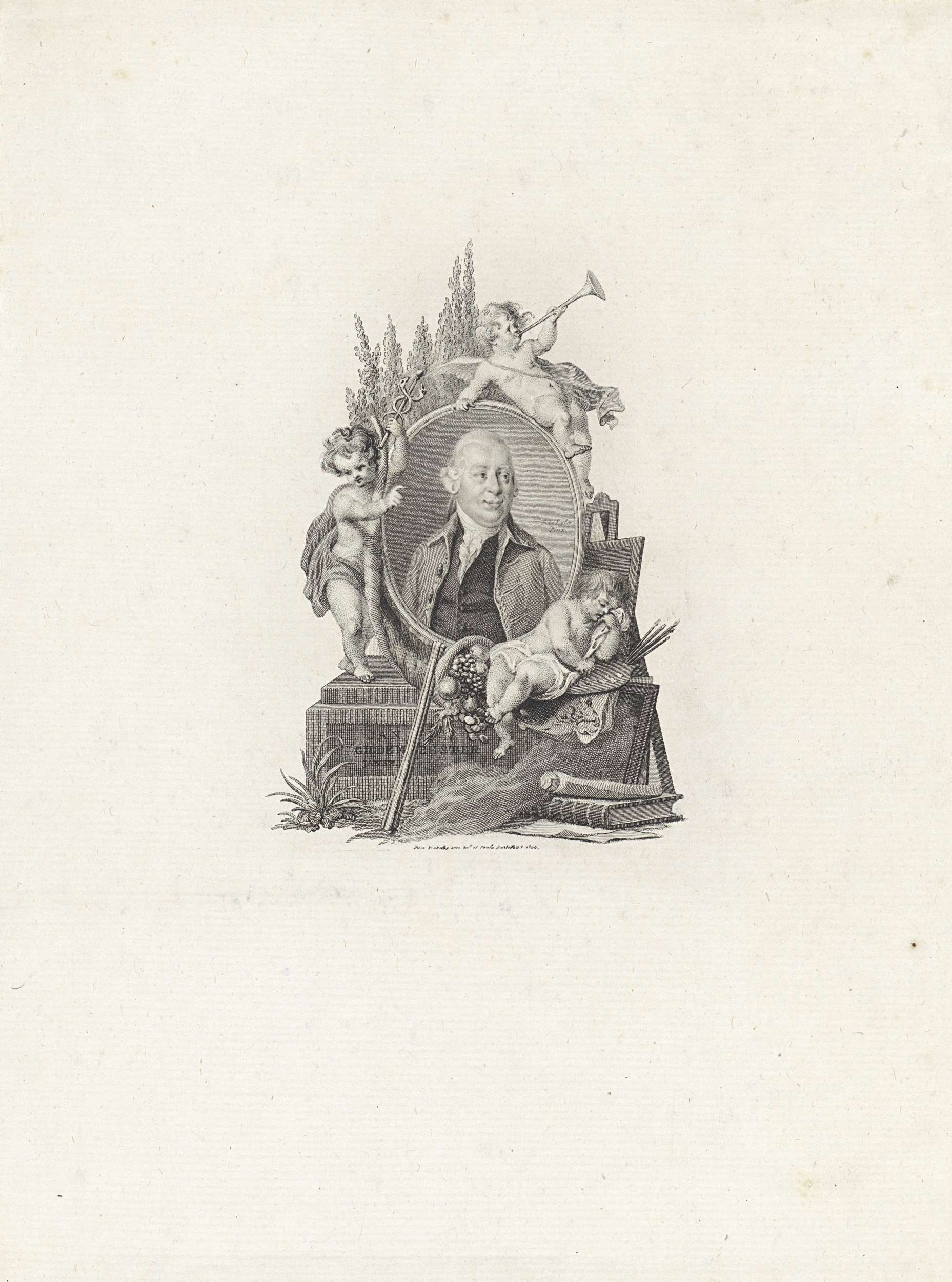 Portret van de Amsterdamse kunstliefhebber Jan Gildemeester Jansz in een ovaal medaillon op een sokkel. Bovenaan een putto blazend op een bazuin, links een putto met caduceus en rechts een treurende putto bij schildersattributen als palet, penselen en schildersezel met naast hem en hoorn des overvloeds. Tegen de sokkel rust een uitgedoofde fakkel.