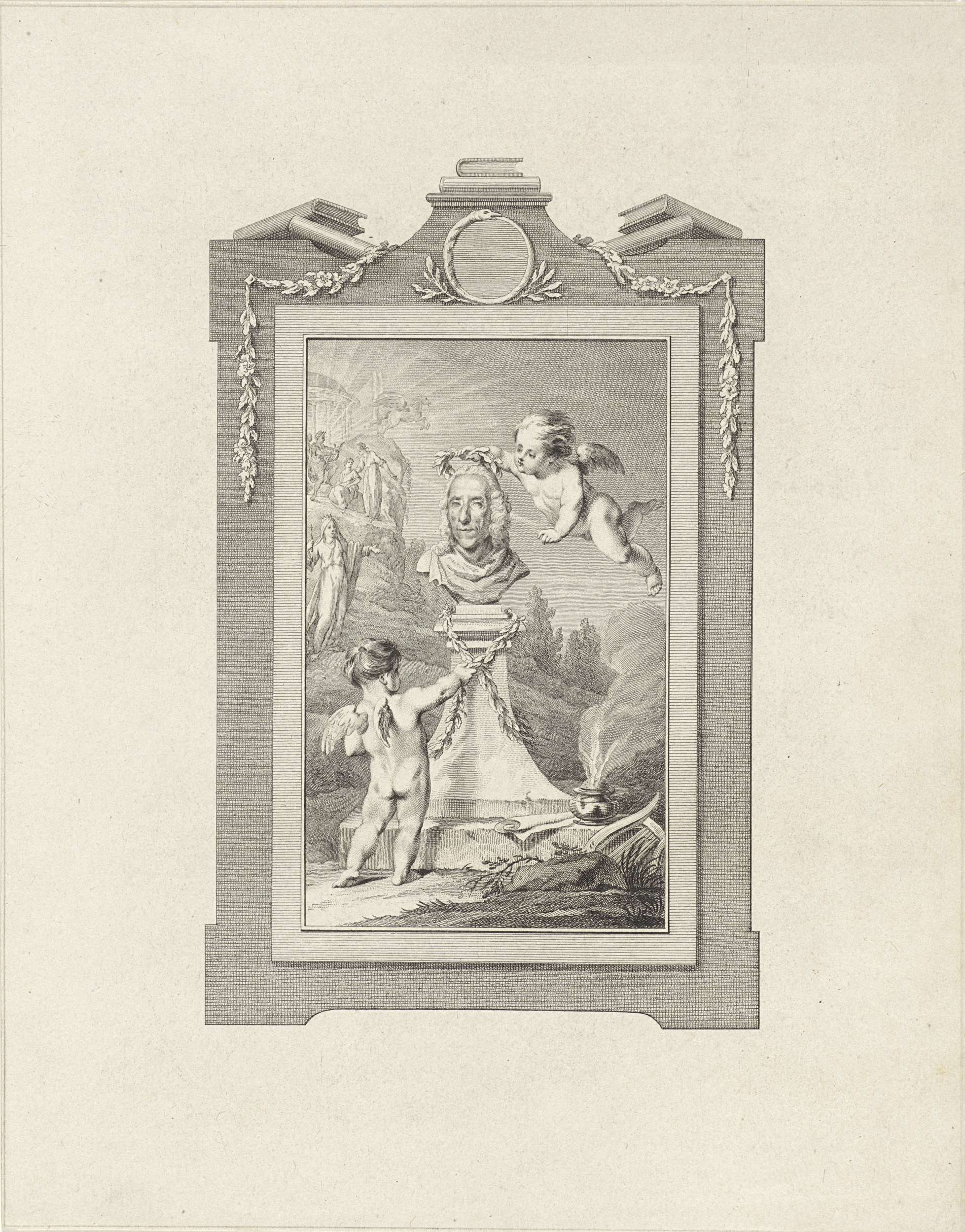 Allegorische voorstelling met borstbeeld van Sybrand Feitama