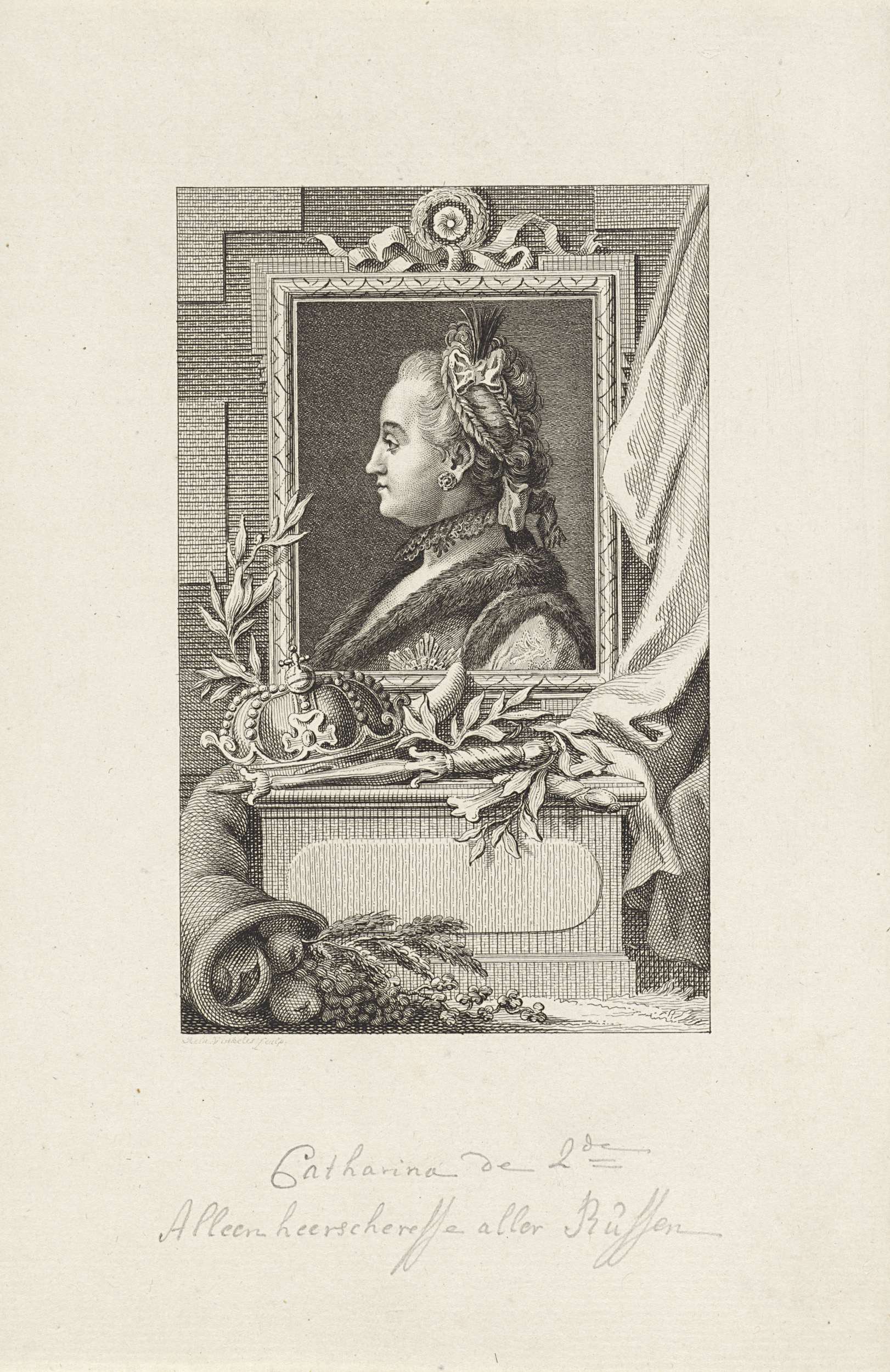 Portret van Catharina de Grote, met voor het portret tsarenkroon en scepter.