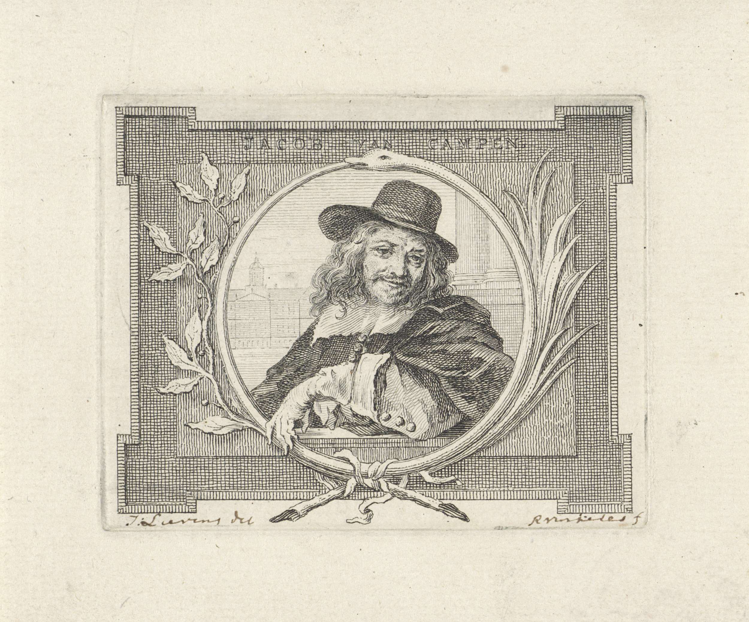 Portret van de bouwmeester Jacob van Campen, binnen het eeuwigheidssymbool de Ouroboros. Achter hem het Stadhuis van Amsterdam (1655-1808).