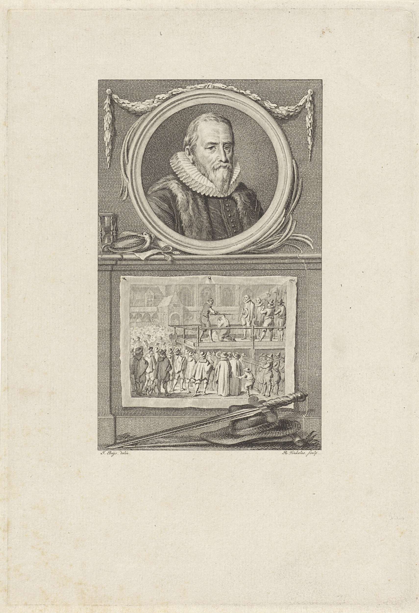 Portret van Johan van Oldenbarnevelt, jurist en landsadvocaat van Holland. Onder zijn portret een afbeelding van zijn executie op het schavot voor de Ridderzaal op het Haagse Binnenhof, opgeprikt vel papier. Op de voorgrond zijn hoed, wandelstok en het zwaard waarmee hij werd onthoofd.